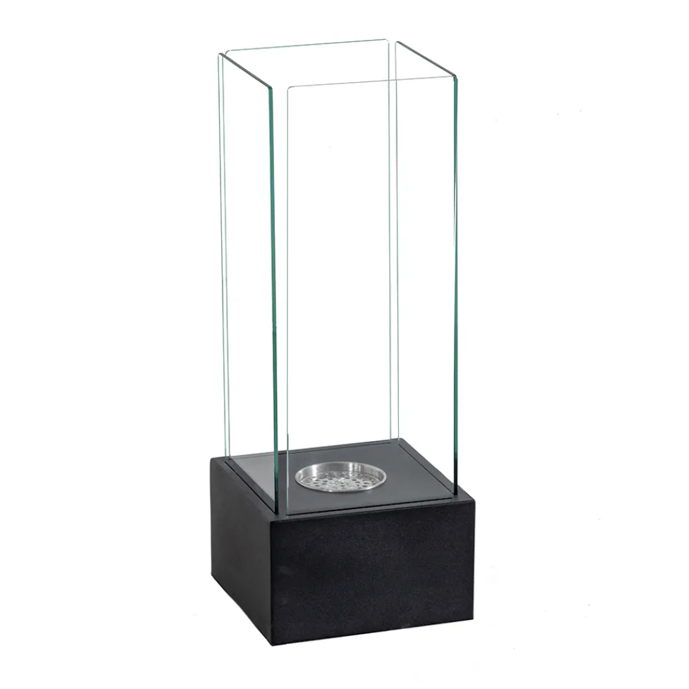 Bodenstehender Bioethanol-Kamin mit einzigartigem Design, bestehend aus einer schwarzen Metallstruktur und gehärtetem Glas , das die Flamme vor Windböen schützt und sie hervorhebt.