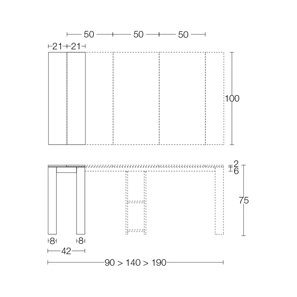- Länge: 42/90/140/190 cm x Tiefe: 100 cm x Höhe: 75 cm – 3 Verlängerungen von 50 cm