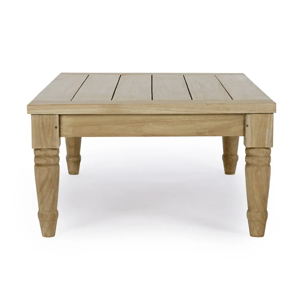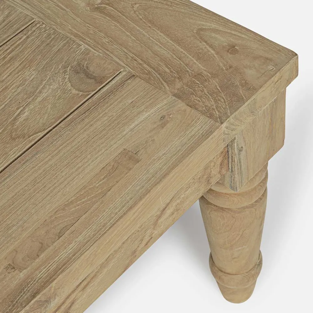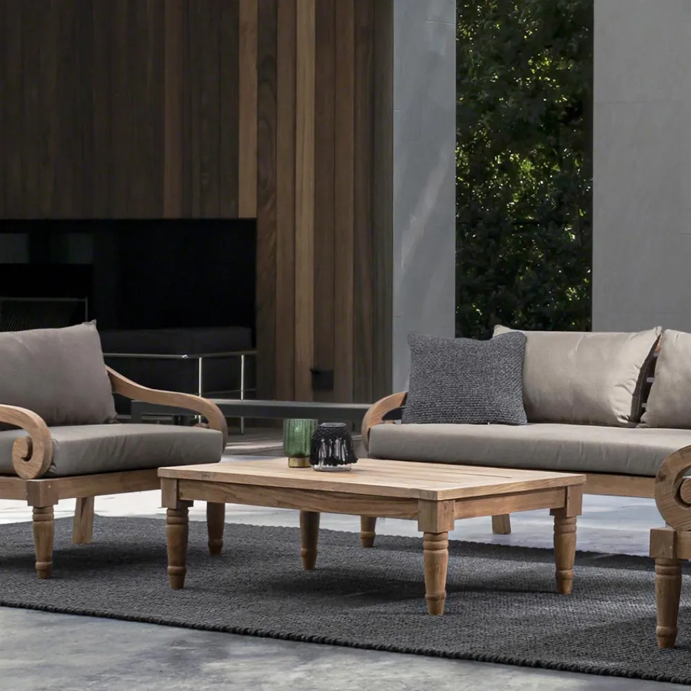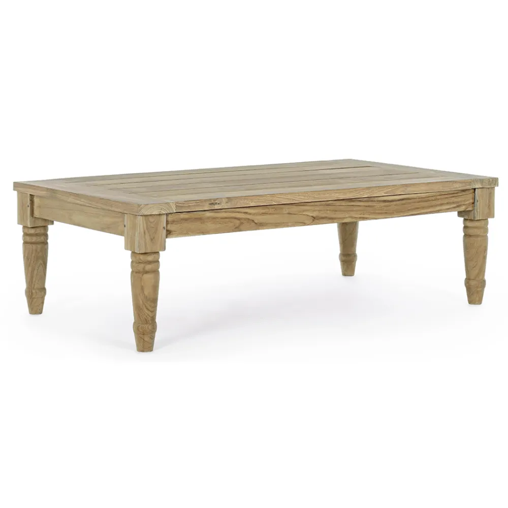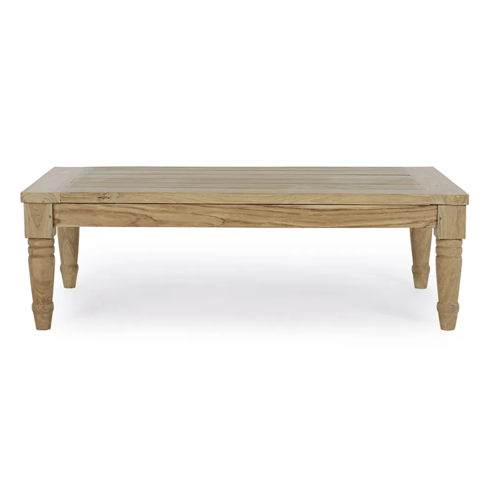 Rechteckiger Außen-Couchtisch aus Teakholz mit rustikalem Finish.