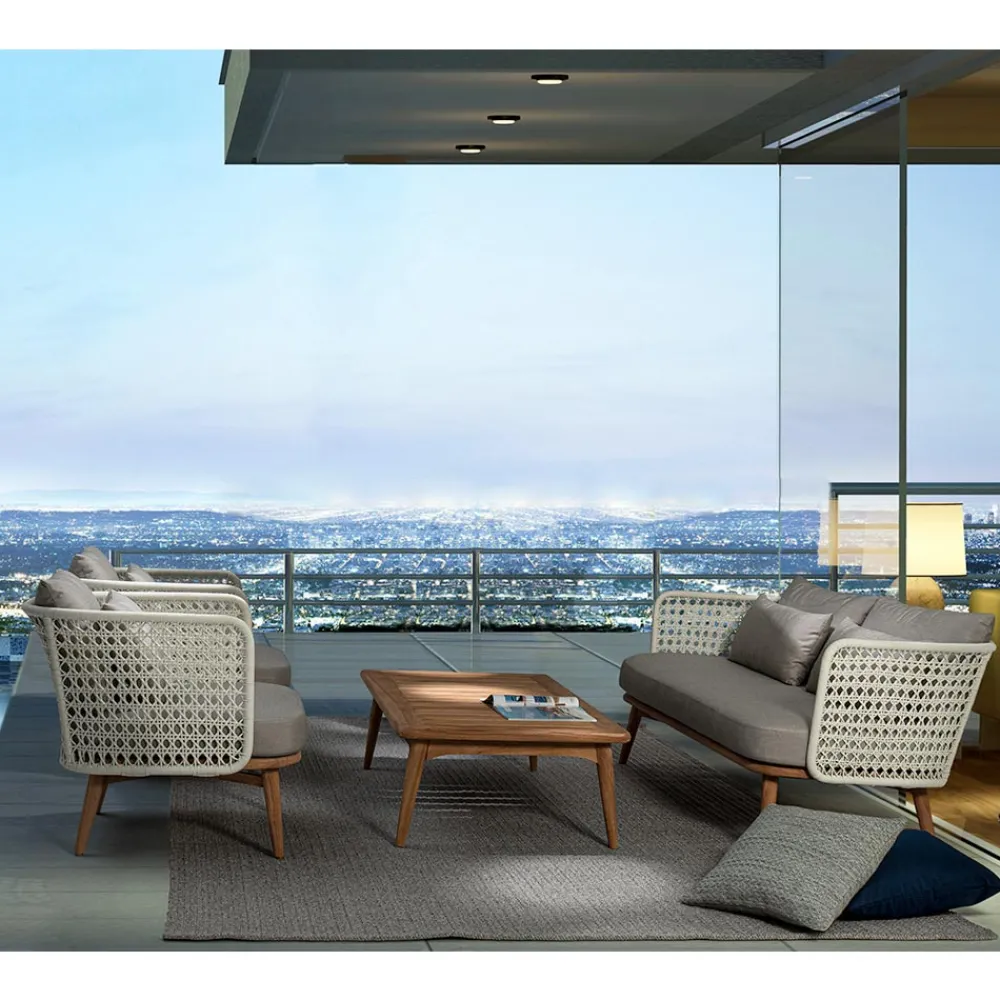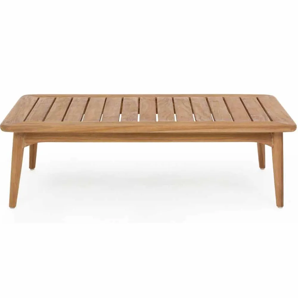 Gartentisch im modernen Design aus natürlichem Teakholz.