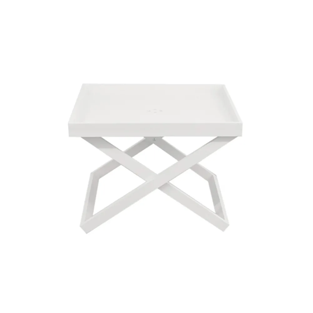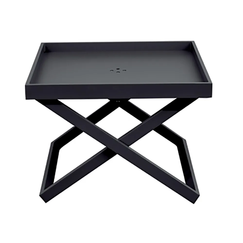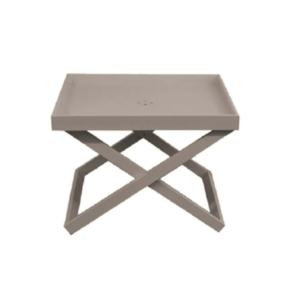 Quadratischer Outdoor-Couchtisch mit abnehmbarem Tablett und epoxidpulverbeschichteter Aluminiumstruktur.