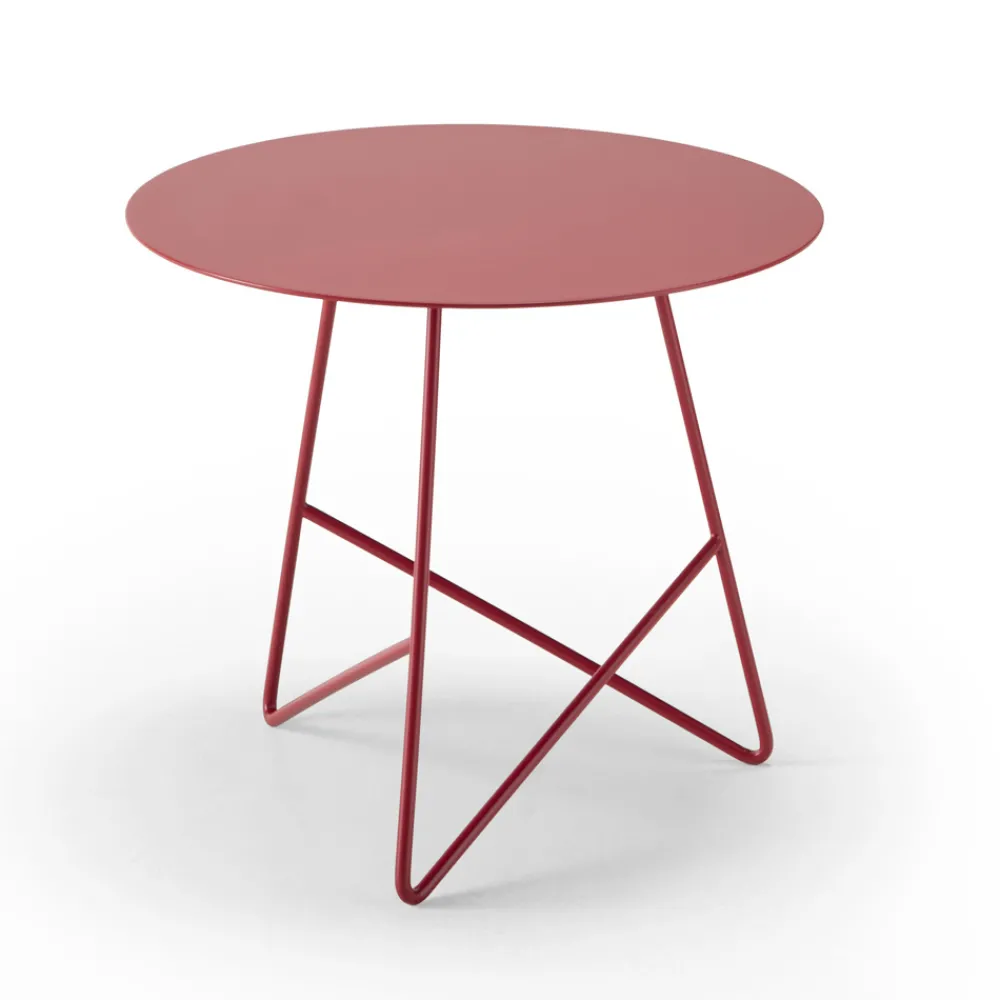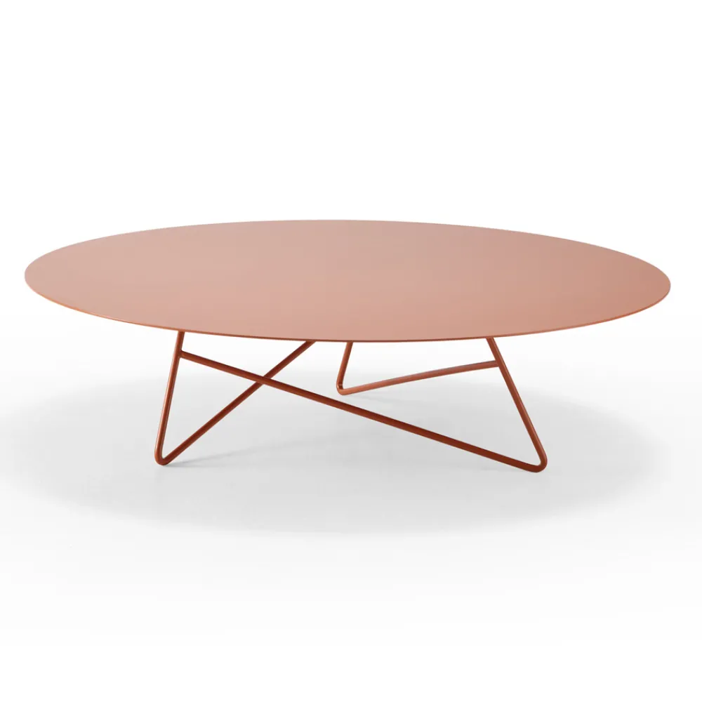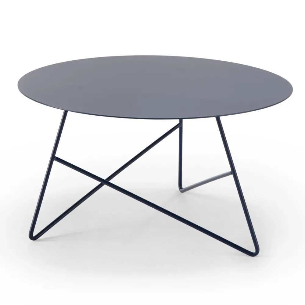 Dieser Couchtisch im Freien hat ein äußerst essentielles und modernes rundes Design mit einer leichten, aber soliden Struktur, die die großzügig geschnittene Platte trägt.