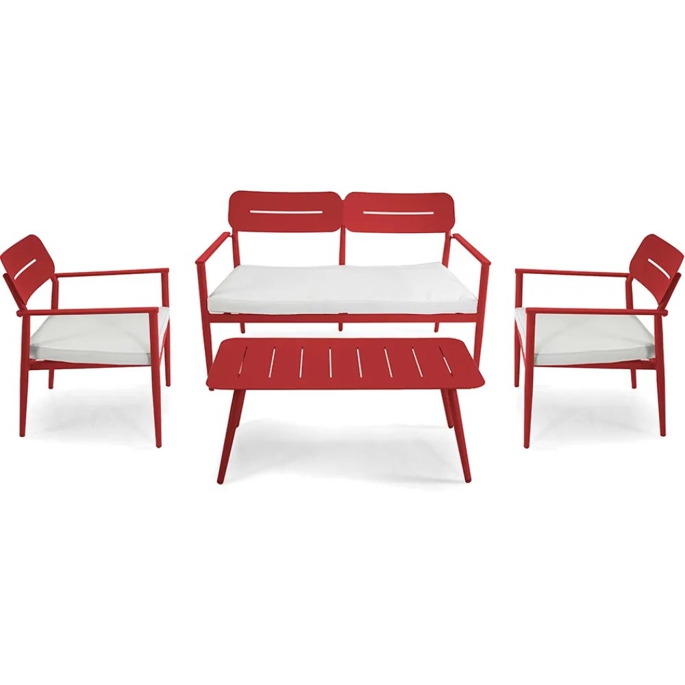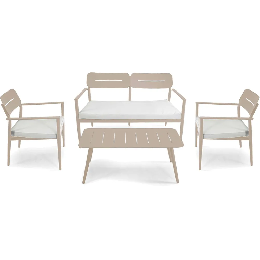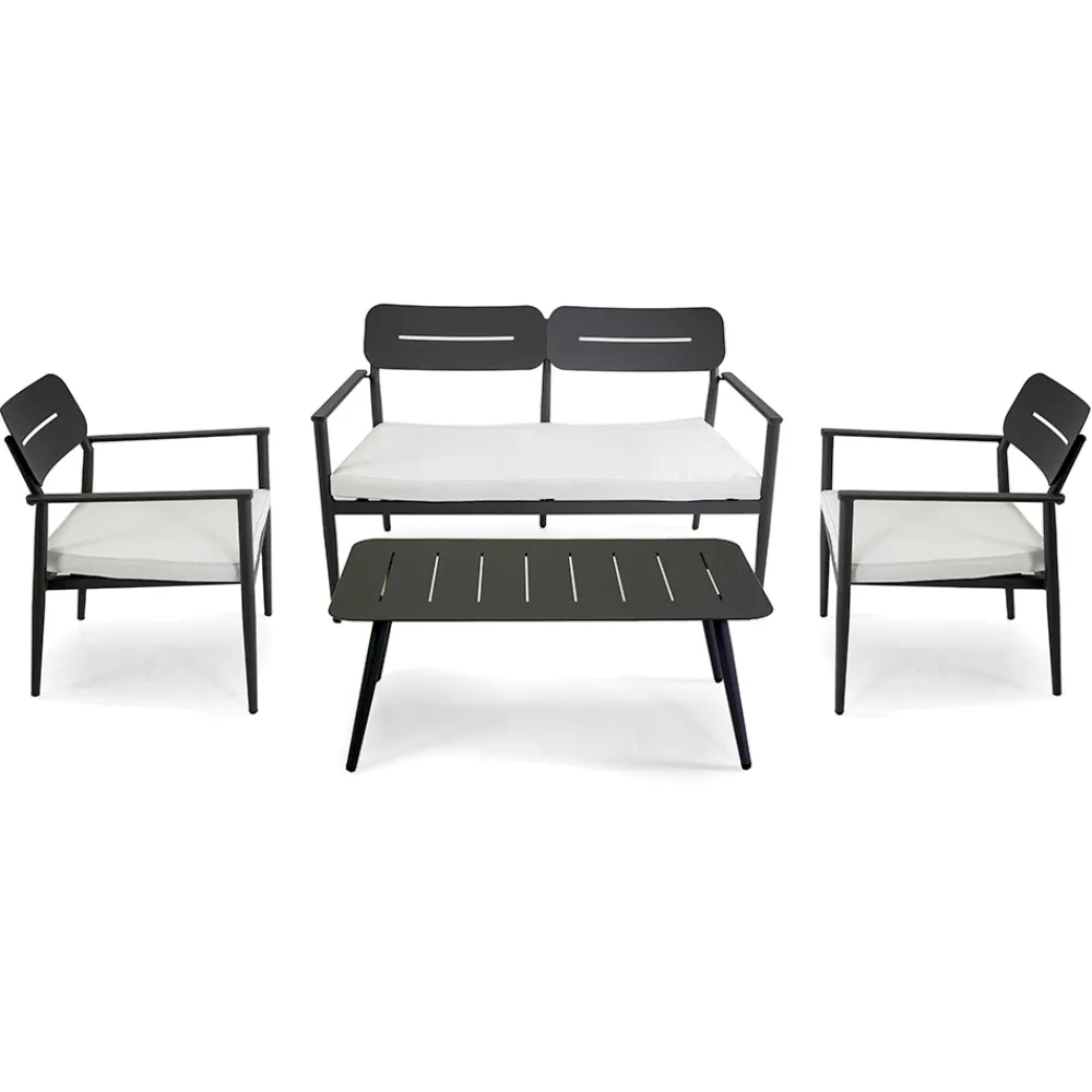 Diese Outdoor-Lounge kombiniert Funktionalität und modernen Stil , perfekt für alle, die ihren Außenbereich geschmackvoll einrichten möchten. Der Aluminiumrahmen ist sowohl elegant als auch robust und garantiert eine lange Lebensdauer und einfache Wartung. Jedes Element des Sets ist so konzipiert, dass es maximalen Komfort bietet, vom Sessel mit seiner ergonomischen Rückenlehne bis zum geräumigen Sofa mit weichen und einladenden Kissen.