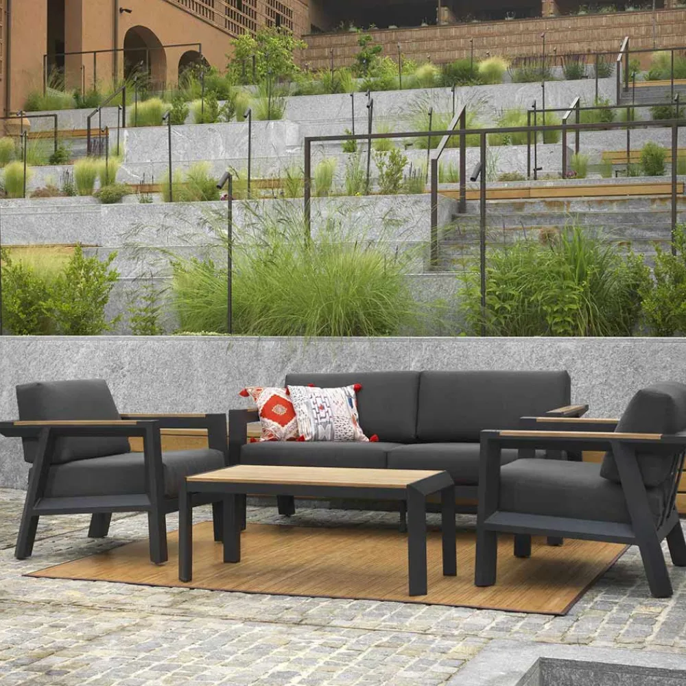 1 Sofa: Gestell aus rostfreiem pulverbeschichtetem Aluminium in Anthrazit, wasserabweisende Kissen aus dunkelgrauem Polyester, abnehmbare Bezüge und Armlehnen aus TEAK-Holz aus Brasilien