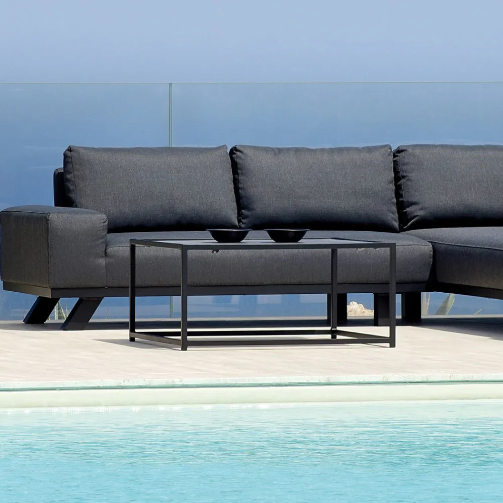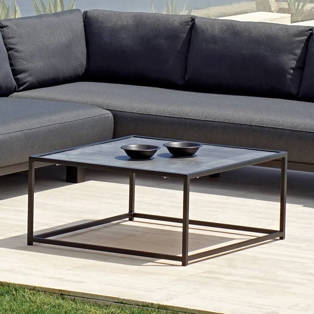 Gartenlounge mit 2 Sofas, Struktur aus schwarzem Aluminium und Couchtisch aus Keramik.