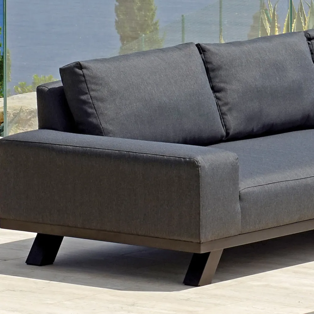 Gartenkomposition bestehend aus einem 3-Sitzer-Sofa und einem 2-Sitzer-Sofa mit Kissen und Armlehnen aus schwarzem, weichem Textilene mit schnell trocknender Polsterung und einem Couchtisch mit Keramikplatte und schwarzem Aluminiumgestell . Inklusive Edelstahlschrauben. Ein Outdoor-Wohnzimmer, das sich durch einen neutralen und eleganten Stil auszeichnet, dessen Ästhetik durch essentielle Formen unterstrichen wird, die sich perfekt an jeden Einrichtungsstil anpassen.