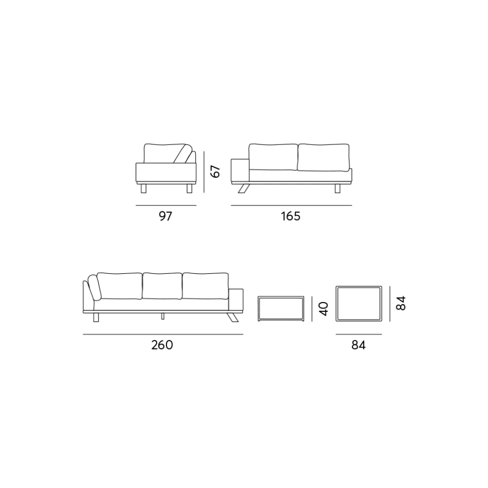 - Dreisitzer-Sofa: B 260 x T 97 x H 67 cm;