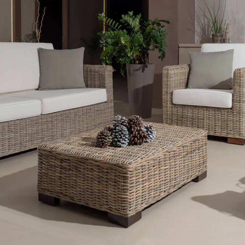 Das Wohnzimmer gehört zu einer ganzen Kollektion, die durch das naturgraue Kubu mit geraden Linien und einer breiten Sitzfläche gekennzeichnet ist. Kubu ist ein natürliches Material, das zu den resistentesten gehört, die man in der Natur finden kann, das aber immer sehr leicht bleibt. Komfort und Wesentlichkeit in einem zeitlosen Stil, der dank der Verwendung von Naturfasern, die die Natur bereitstellt, Gestalt annimmt.