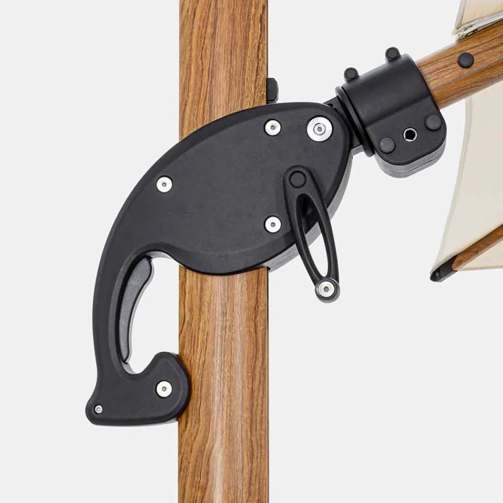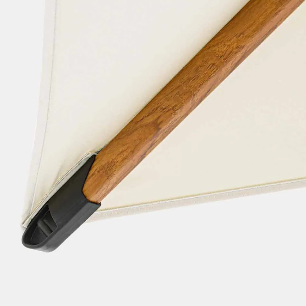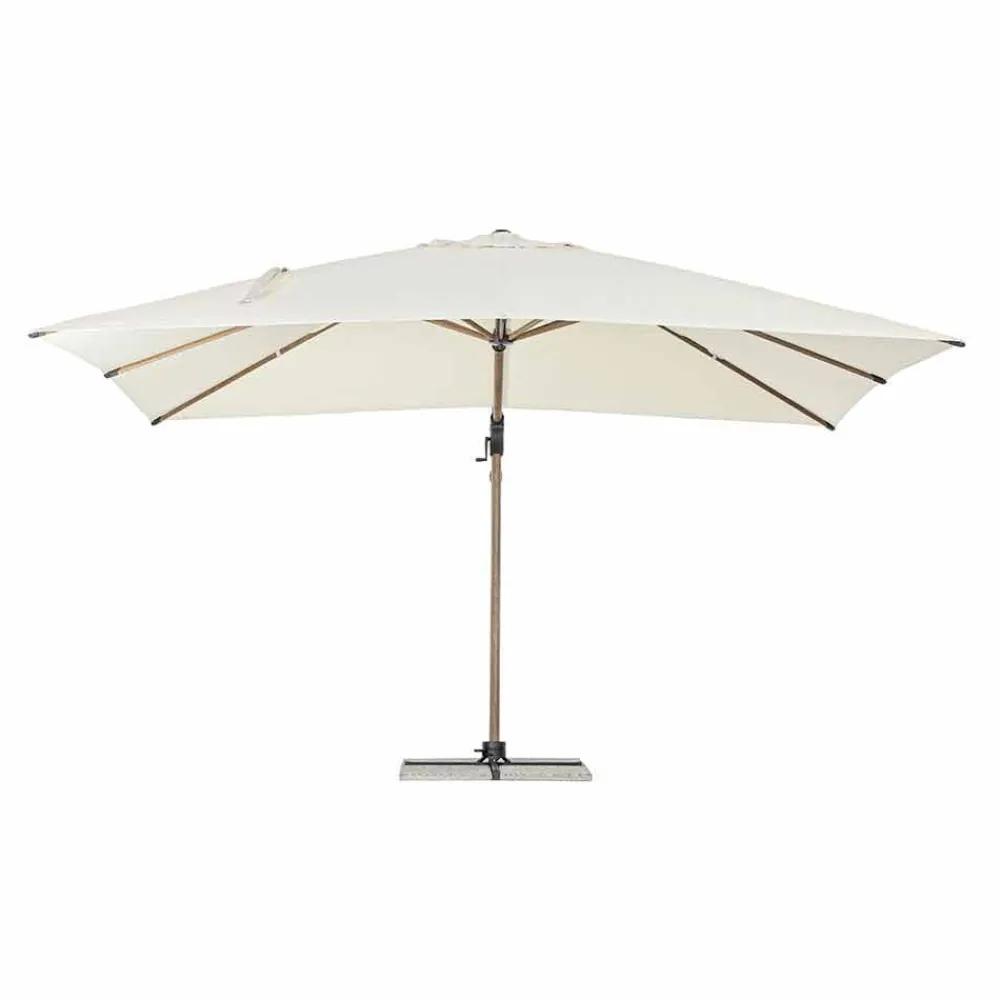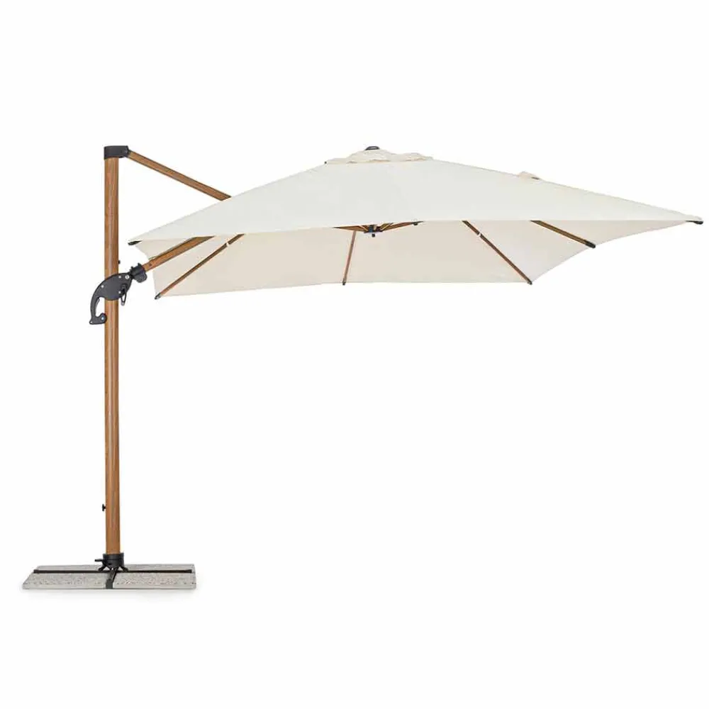 Aluminiumstruktur , pulverbeschichtet (Polyester) mit Holzeffekt. 90x60mm Stange, 8 Rippen 25×17 mm. Beige Polyestergewebe 250 gr / m2 mit PA (Polyamid) Beschichtung. Kreuzfuß aus Stahl . 360° drehbare Stange mit Pedal. Vertikale Neigung mit 5-Positionen-Griff. Ausgestattet mit einem Rechts-Links-Schirmkippsystem . Inklusive Schirmhülle .