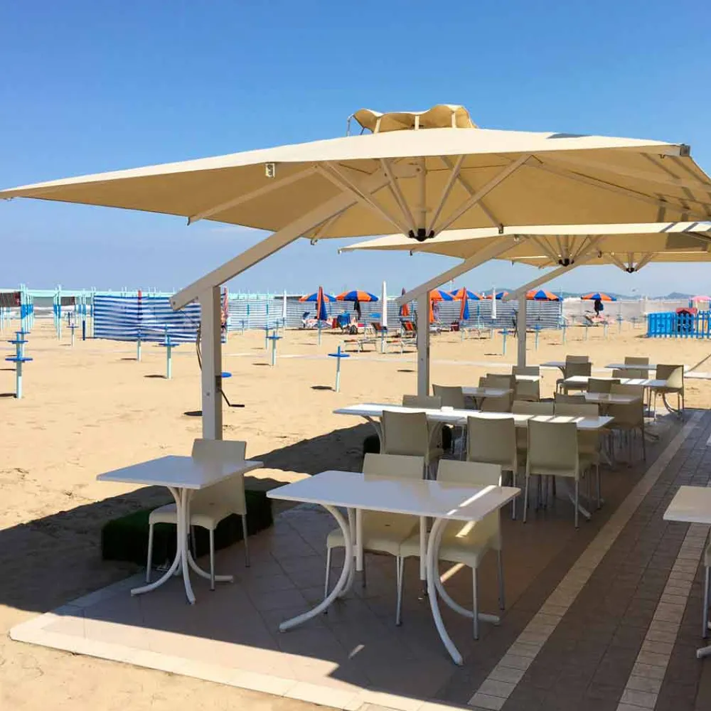 Das besondere Design dieses Gartenschirms ermöglicht die Befestigung des Arms von unten statt von oben an der Ecru-Acryl-Leinwand, wodurch der Regenschirm stärker und widerstandsfähiger wird.