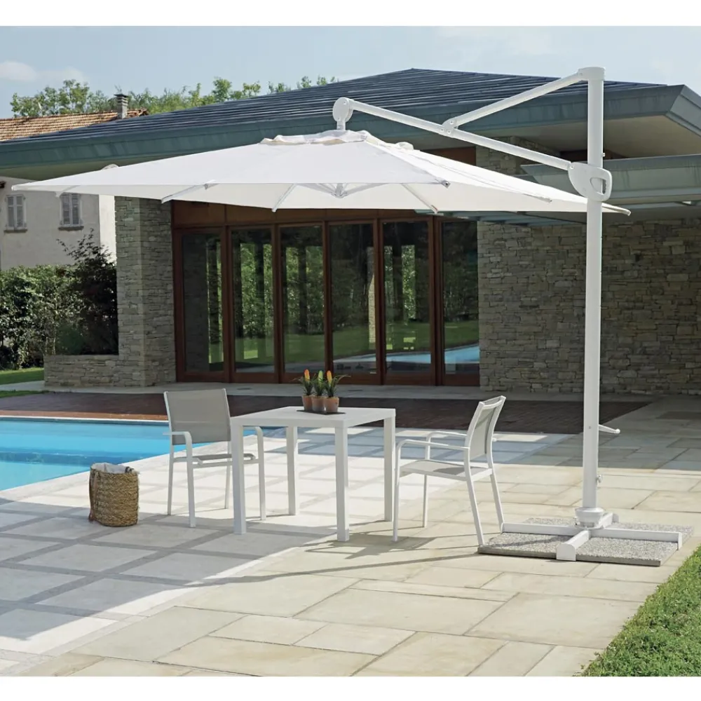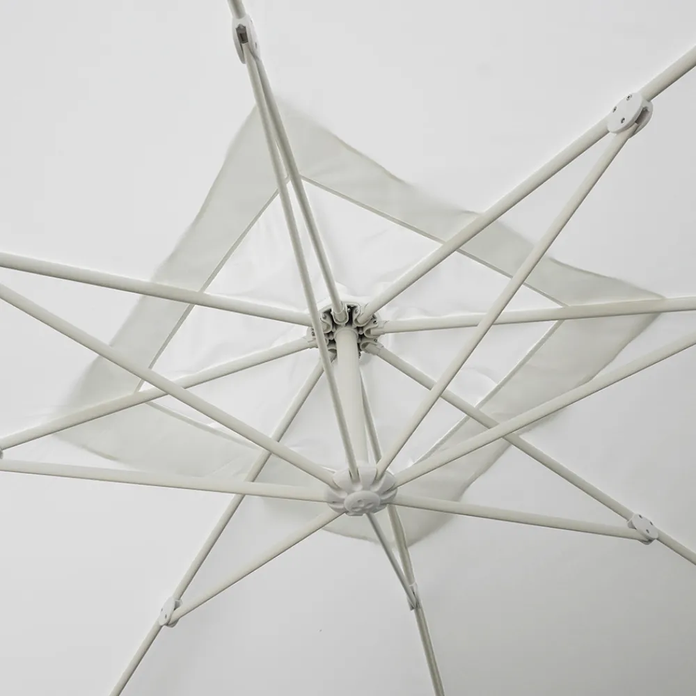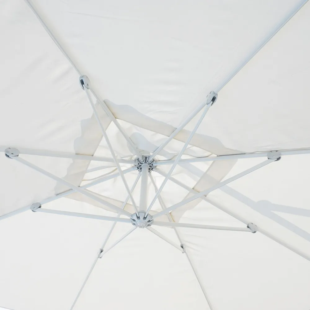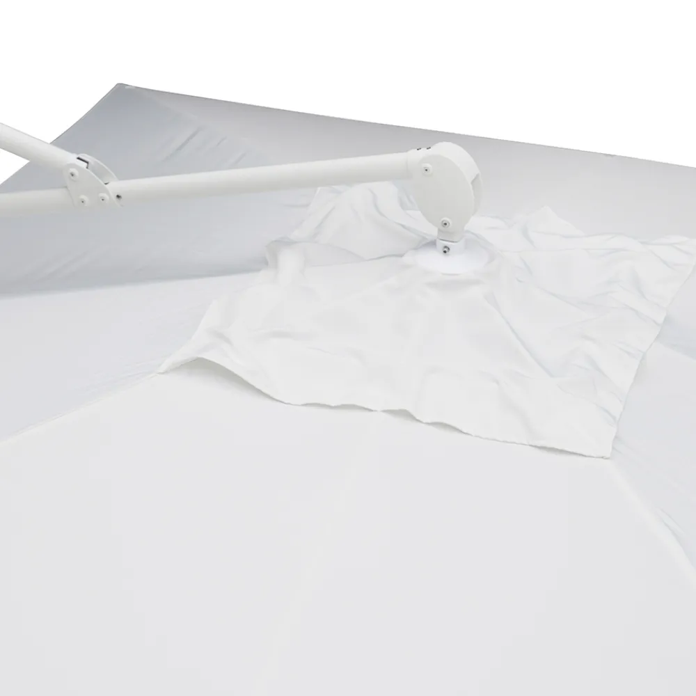 Quadratischer Regenschirm für den Außenbereich mit weißer Aluminiumstruktur.