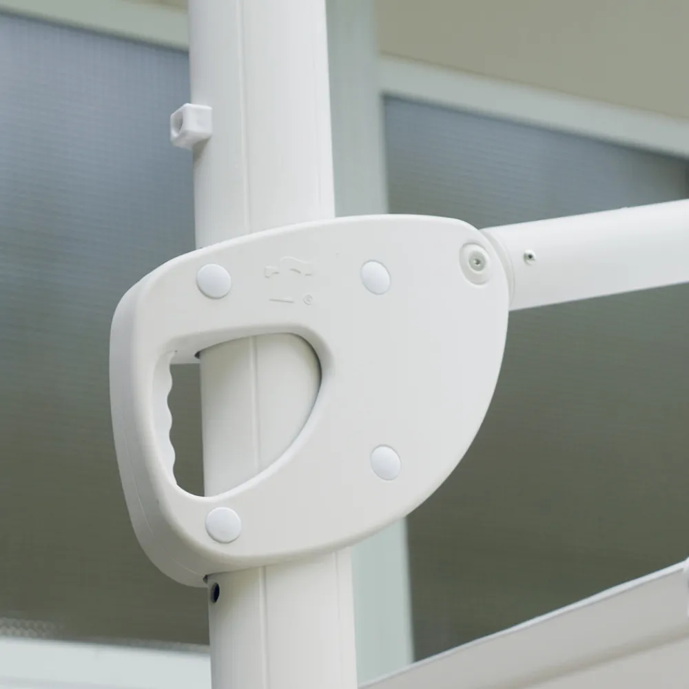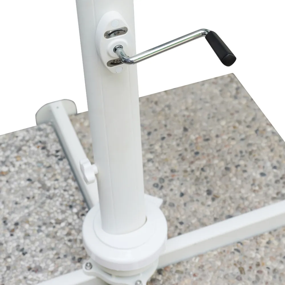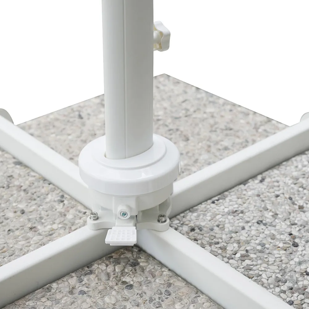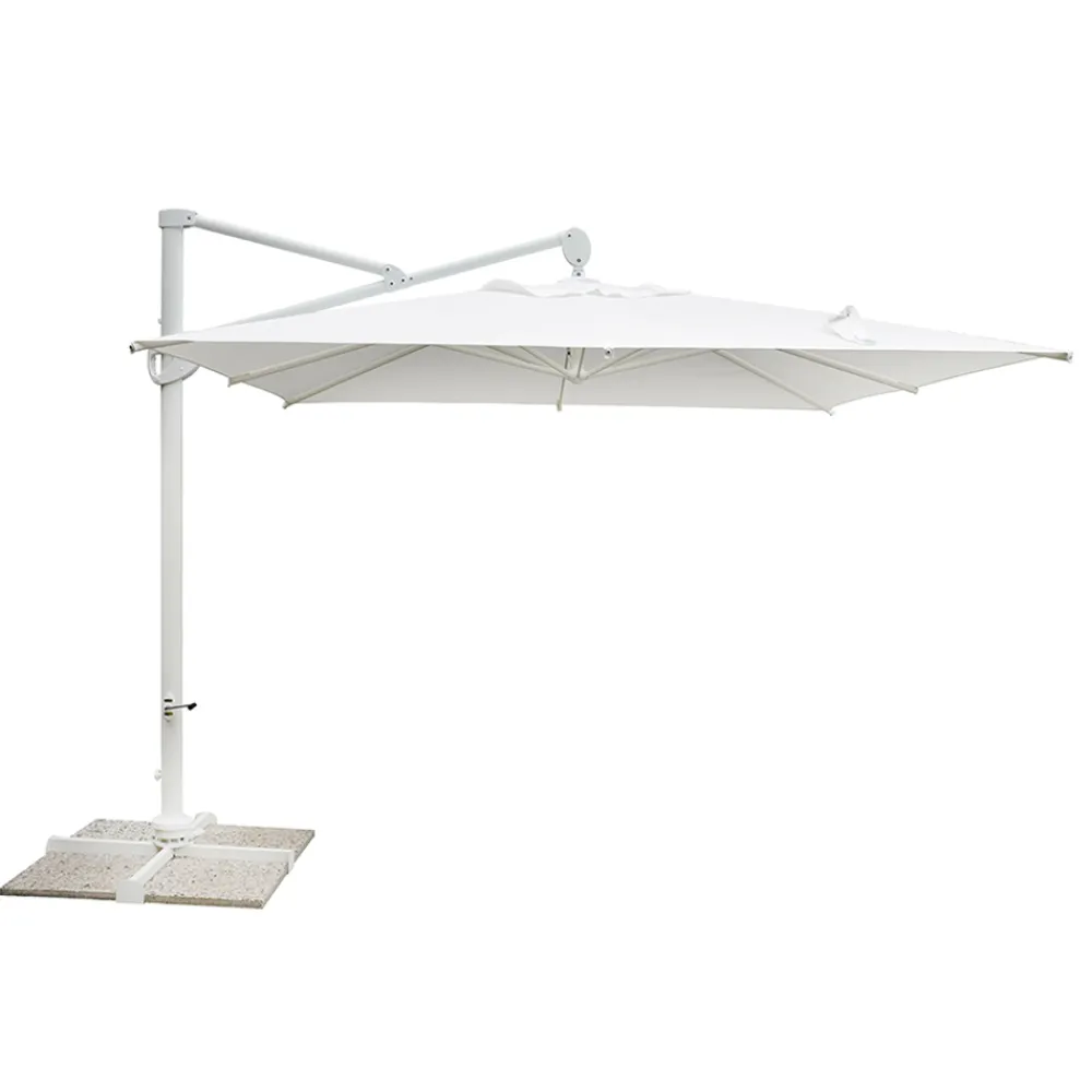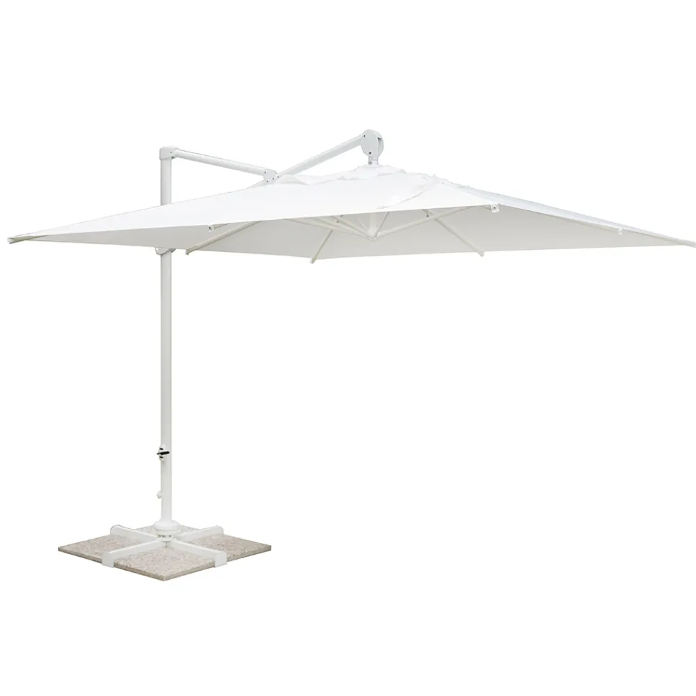 Quadratischer Regenschirm für den Außenbereich mit weißer Aluminiumstruktur.