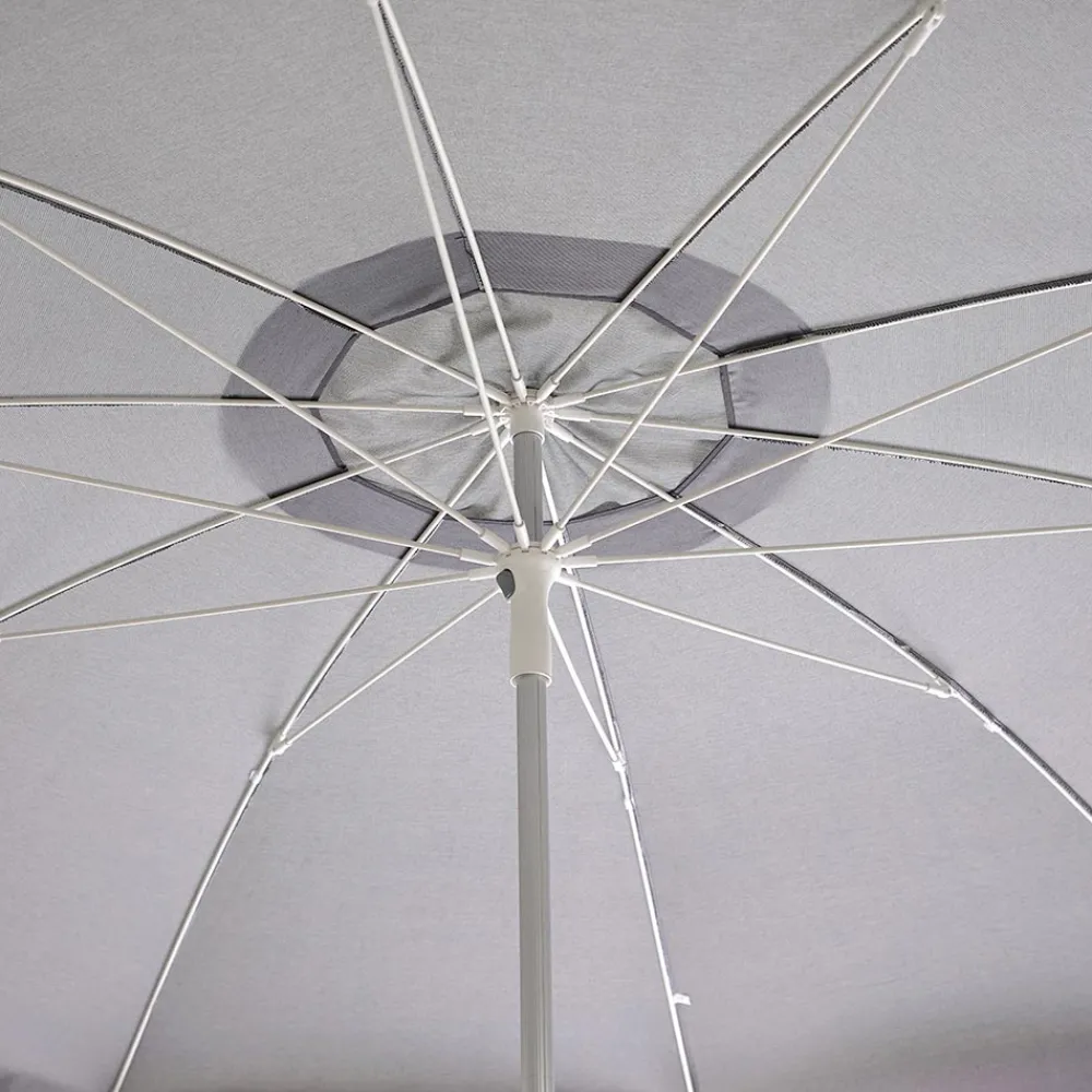 Sonnenschirm mit 190 g Olefingewebe mit hohem UV-Schutz und Struktur aus 35/40 mm gestreiftem, eloxiertem Aluminium , komplett mit Verlängerung mit Schraubverschluss und 10 Fiberglasstäben. Ideal für Umgebungen wie Schwimmbäder und Hotels, aber auch für Wohnräume wie Gärten und Terrassen, wo er perfekt passt, hat dieser Sonnenschirm ein einfaches und essentielles Design , bereichert und einzigartig gemacht durch die wunderbaren verfügbaren Farben, die ein originelles und allumfassendes Aussehen verleihen. runde Note Avantgarde .