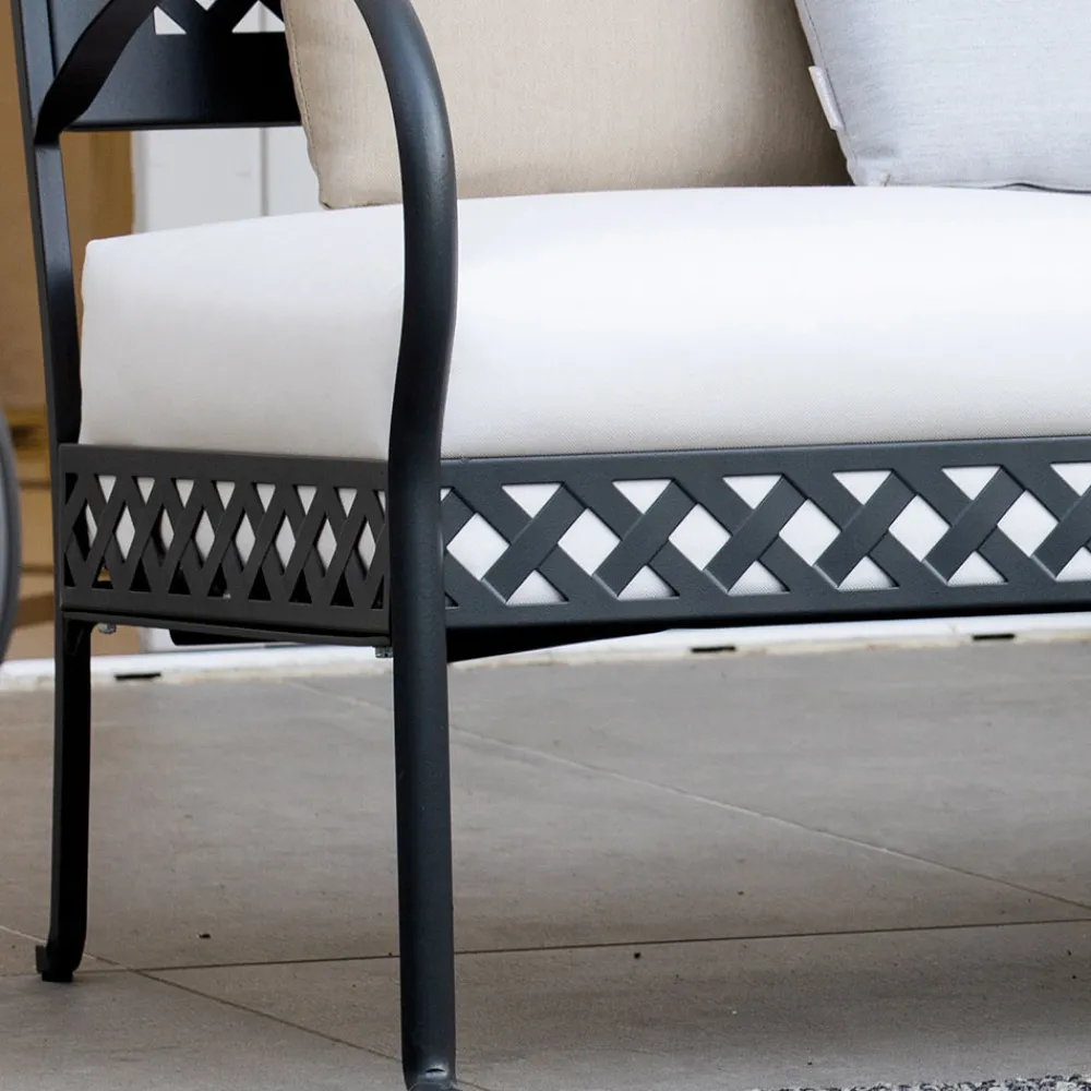 Dieses Outdoor-Sofa ist aufgrund der Qualität seiner Materialien äußerst widerstandsfähig und wird zu 100 % in Italien hergestellt . Die Struktur besteht aus Stahl und wird durch einen Verzinkungsprozess verstärkt, um das Produkt korrosions- und atmosphärisch beständig zu machen.