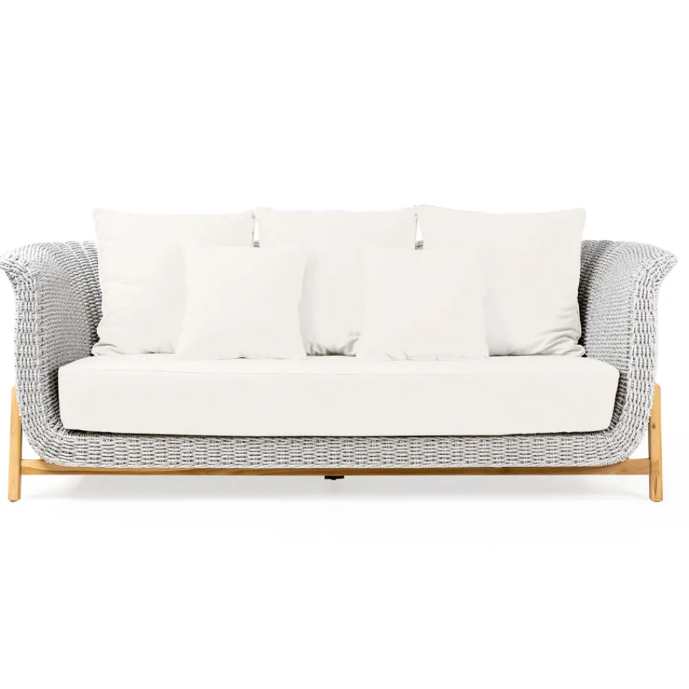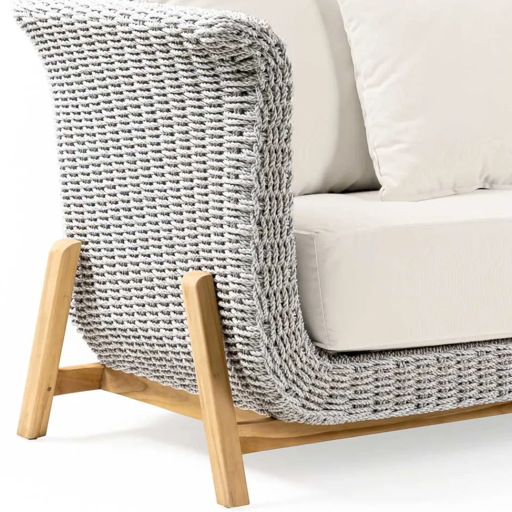 Dieses Outdoor-Sofa besteht aus einer inneren Struktur aus epoxy-pulverbeschichtetem Aluminium Rahmen, mit Basis aus Teakholz und handgeflochtenem VRO-Seil-Einsatz. Es ist komplett mit Sitz- und Rückenkissen aus wasserabweisendem havannagrauem Stoff.