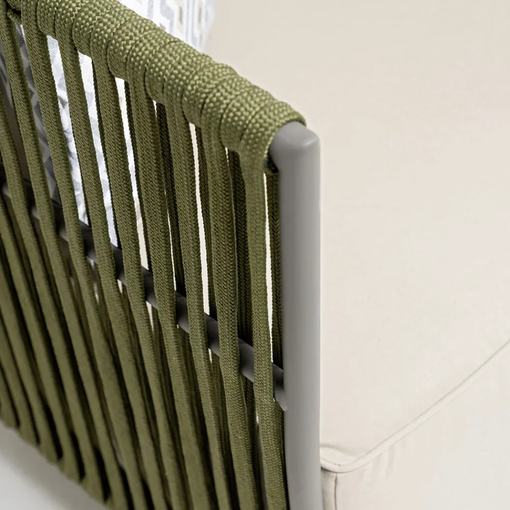 Dieses Gartensofa zeichnet sich durch seine sichtbare Struktur aus anthrazit lackiertem Aluminium und durch die Webung mit Sunproof-Gewebeband (100% Olefin) aus, einem spezifischen Material für den Außenbereich in Waldgrün. Die Sitz- und Rückenkissen aus weißem Outdoor-Stoff mit Seilkeder sind im Lieferumfang enthalten.