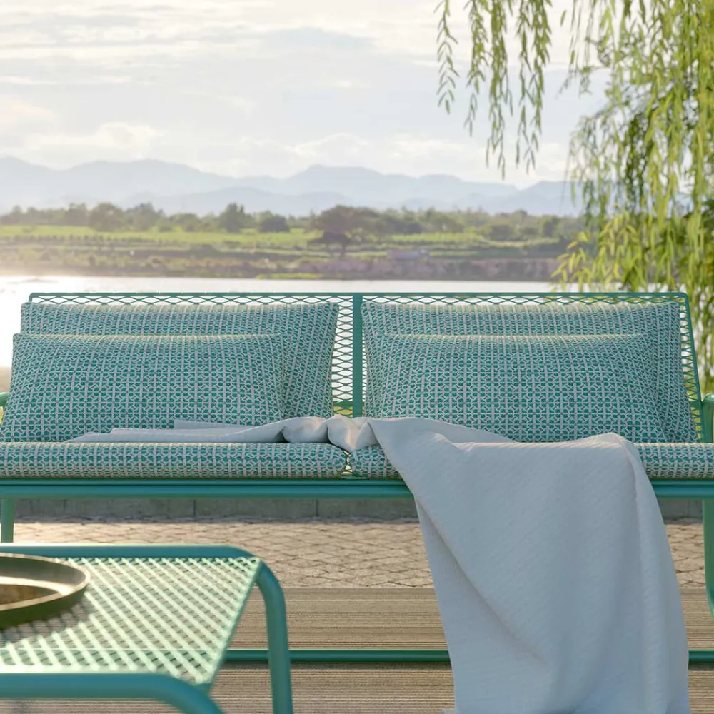 Outdoor-Sofa aus Metall mit aufeinander abgestimmten Stoffkissen in verschiedenen Ausführungen, Luxusartikel made in Italy.