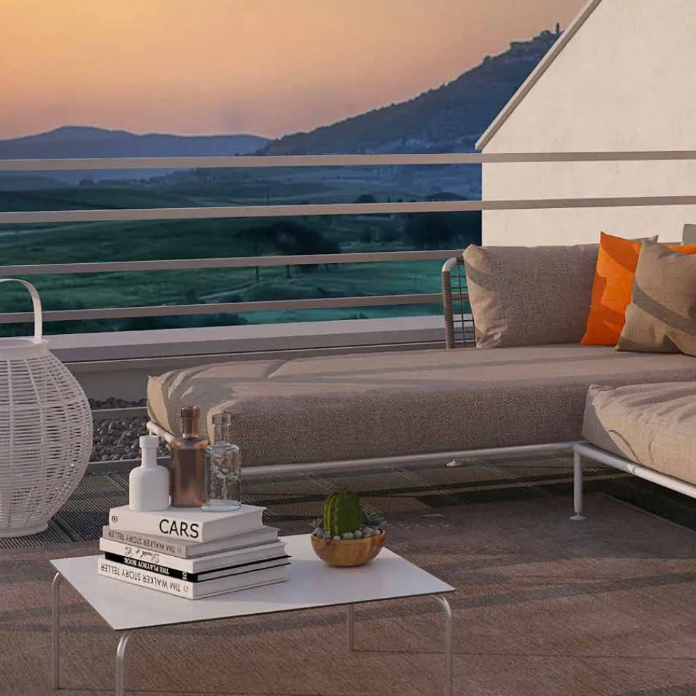 Ecksofa mit Chaiselongue im Freien aus Stahl und weißem oder taubengrauem Stoff in modernem Design, hergestellt in Italien.