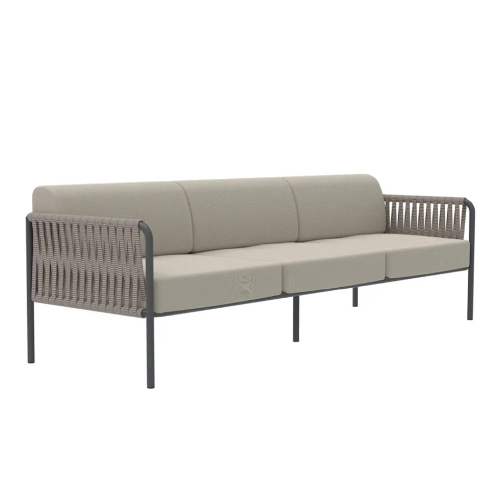 Outdoor-Sofa aus verzinktem Stahl mit Sitz- und Rückenkissen aus Polypropylen und Armlehnen aus Seil, komplett Made in Italy . Die Verzinkung erhöht die Widerstandsfähigkeit der Materialoberfläche gegen korrosive Witterungseinflüsse, während das Seil chlor- und sonnenbeständig sowie schimmelresistent ist. Die Kissen bestehen aus UV- und wasserbeständigem Material, das die Farbe lange erhält.