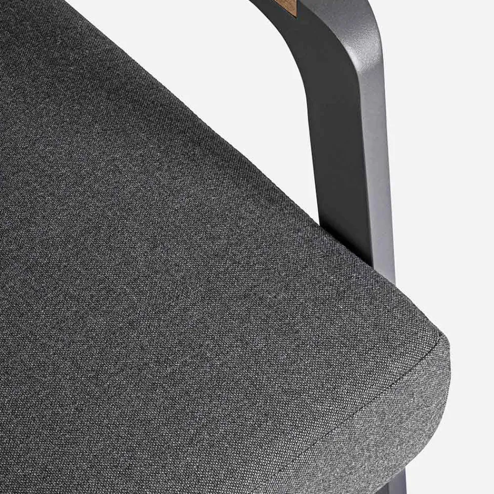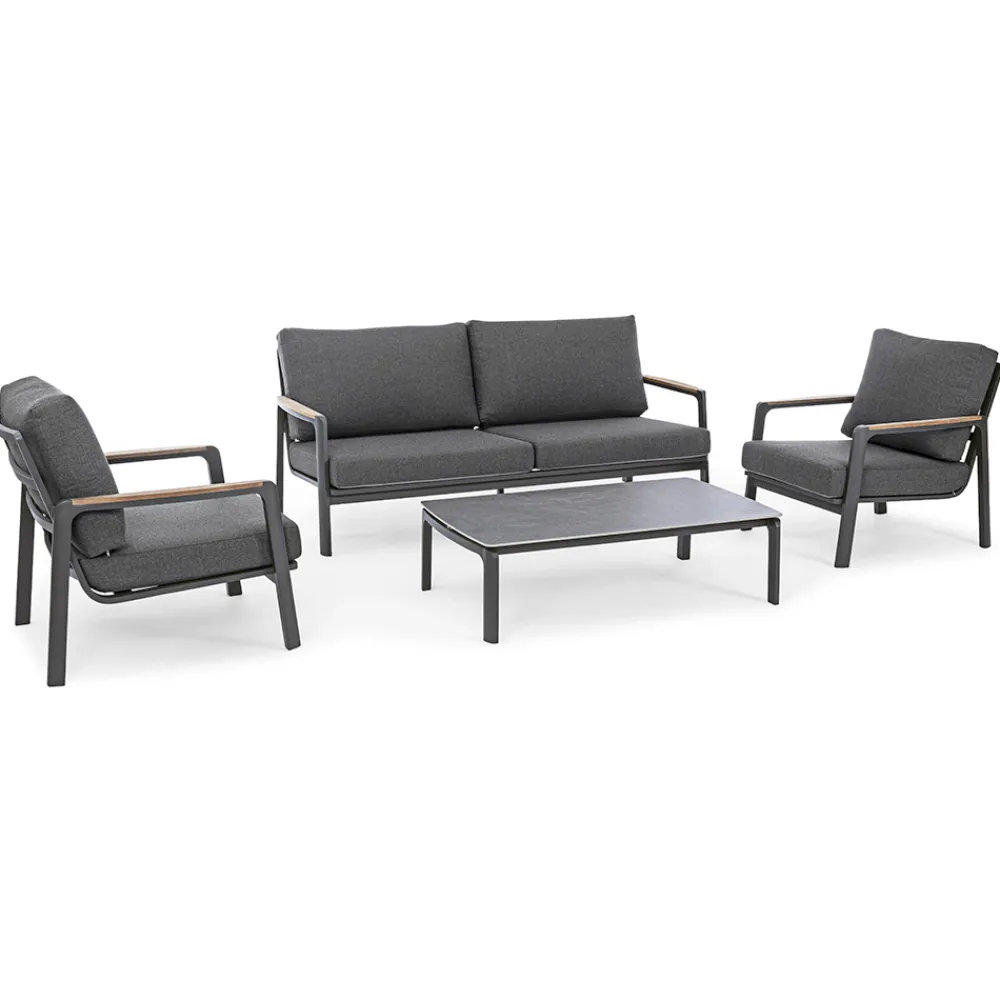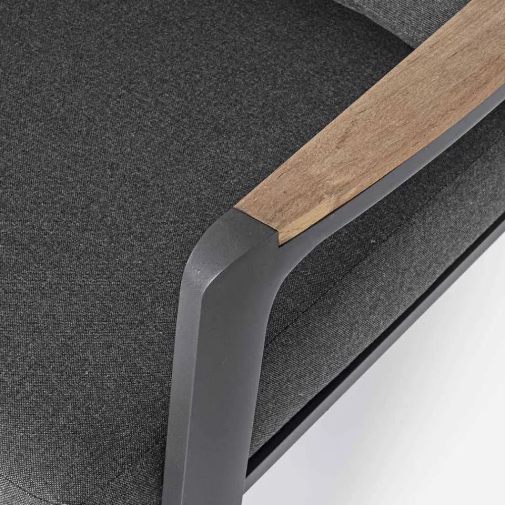 Pulverbeschichtete Aluminiumstruktur (Polyester). Armlehnen mit Teakholzeinsätzen . Sitz- und Rückenkissen mit abnehmbaren Bezügen aus Acrylgewebe .