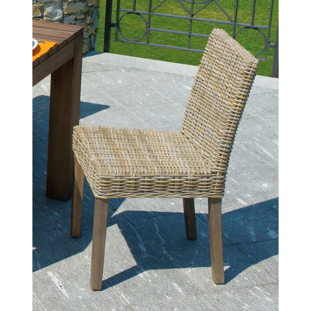 Gartenstuhl mit Holzstruktur , Sitz und Rückenlehne aus natürlicher grauer Kubu-Faser.