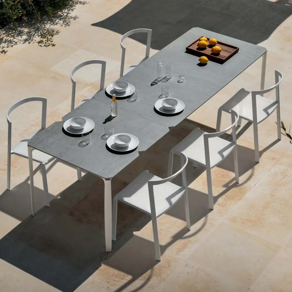 Das Detail des Aluminiumbeins sorgt für Solidität und Widerstandsfähigkeit und verleiht ihm gleichzeitig ein elegantes und funktionales Design , das unglaublich praktisch und ideal für den Einsatz im Außenbereich ist. Der einladende und bequeme Sitz verwandelt diesen Gartenstuhl in ein perfektes Möbelstück, das jeden Außenbereich vervollständigt und ihn mit einem Hauch von modernem und raffiniertem Stil bereichert.