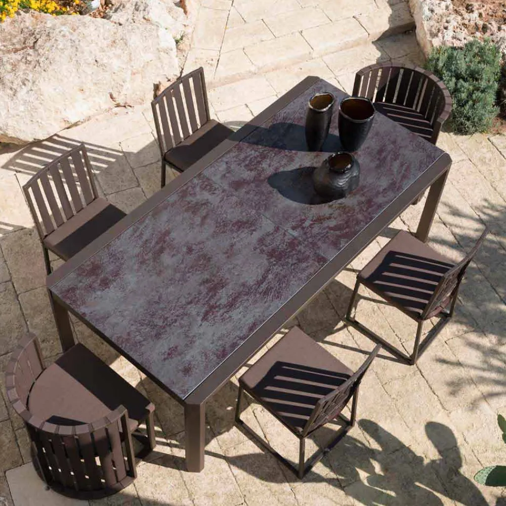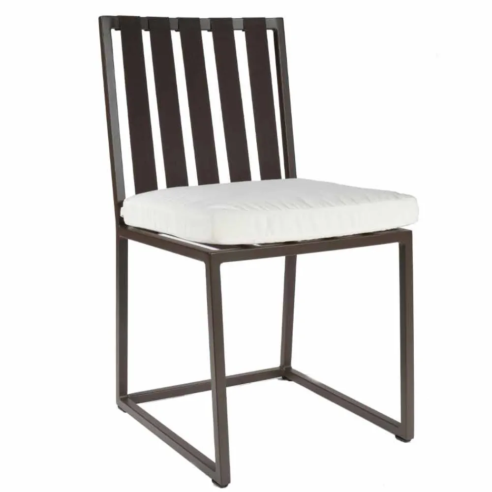 Das raffinierte , elegante und raffinierte Design dieses Outdoor-Stuhls zeichnet sich durch den Wechsel von leeren und vollen Räumen aus, der ein leichtes und zeitgemäßes Erscheinungsbild schafft.