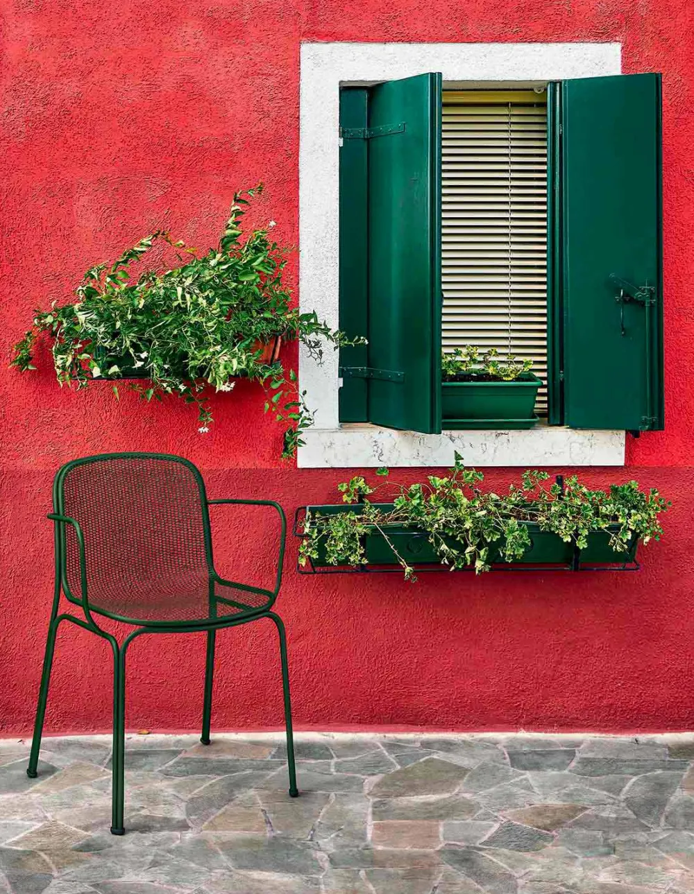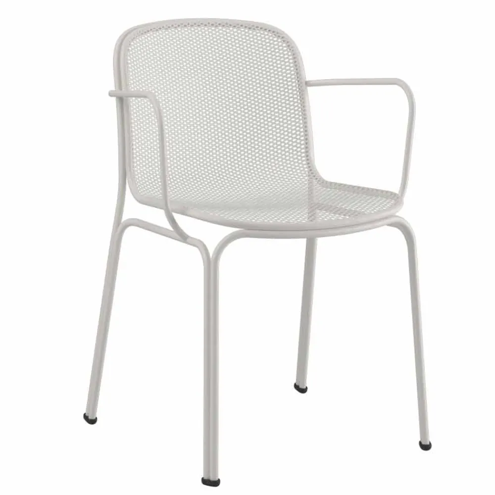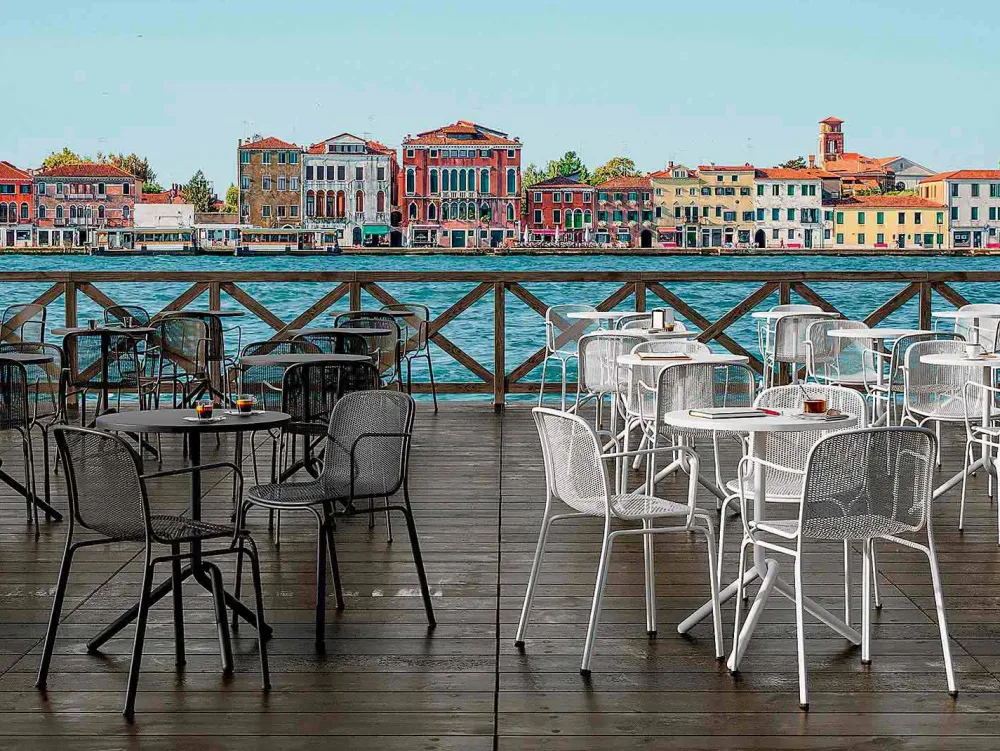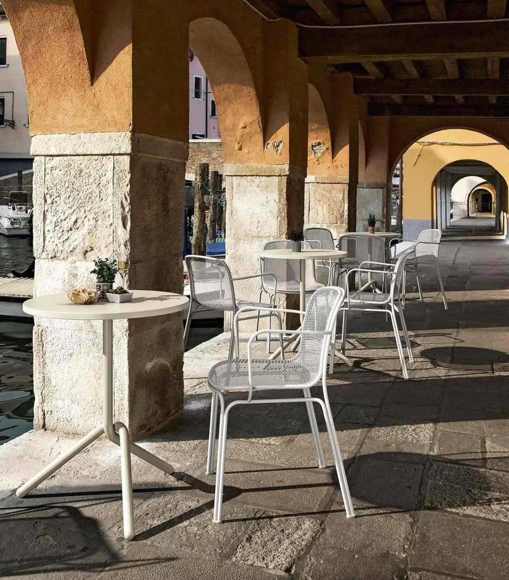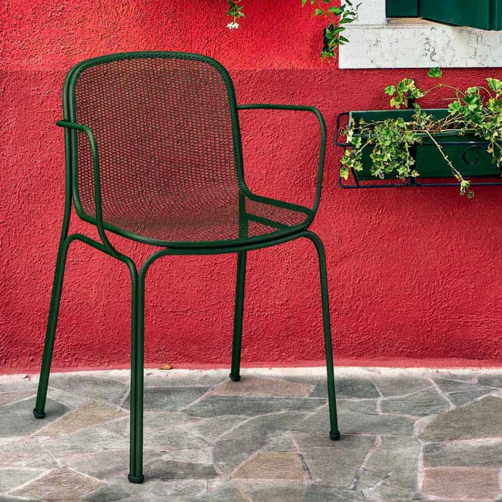 Verna ist ein wunderbarer Outdoor-Stuhl, der vollständig aus Metall und Drahtgeflecht besteht und traditionelle Linien perfekt mit einem zeitgemäßen Design kombiniert, wodurch der Stuhl dank der vorhandenen Armlehnen solide und bequem wird. Dank des im Vergleich zu den Beinen leicht erhöhten Körpers ist es auch extrem einfach zu handhaben. Verna ist in 5 Farbvarianten erhältlich, die es ermöglichen, jeder Umgebung Persönlichkeit zu verleihen. Es ist ein stapelbarer Stuhl mit maximal 6 Einheiten , mit dem Sie den Raum optimal optimieren können.