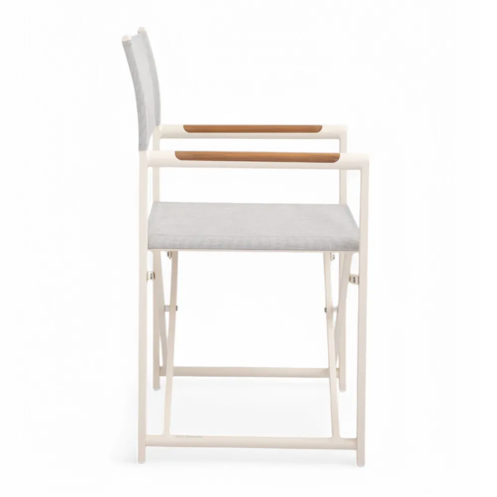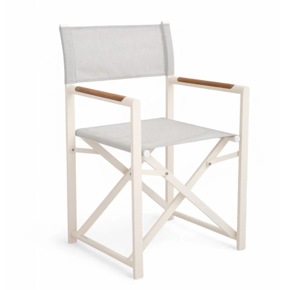 Stuhl für den Außenbereich mit beigefarbenem Aluminiumrahmen, Rückenlehne und Sitzfläche aus weißem Textilene und Armlehnen mit Teakholzdetails.