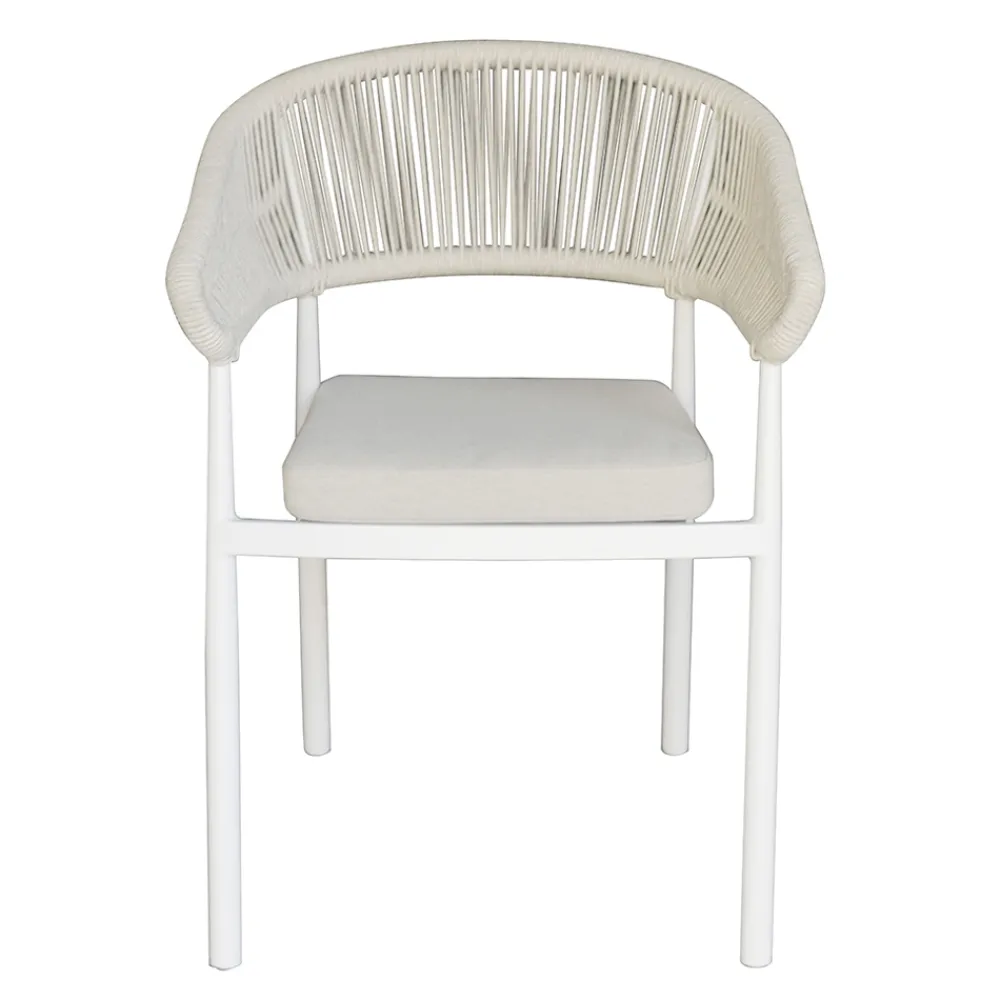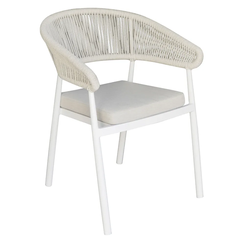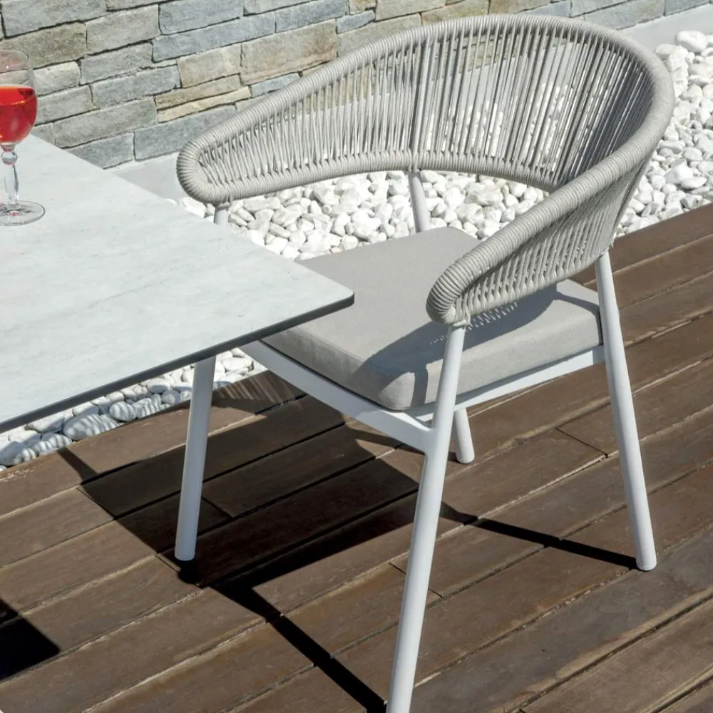 Stapelbarer Outdoor-Stuhl mit Aluminiumrahmen, Seilrücken und Aluminiumsitz mit Kissen.