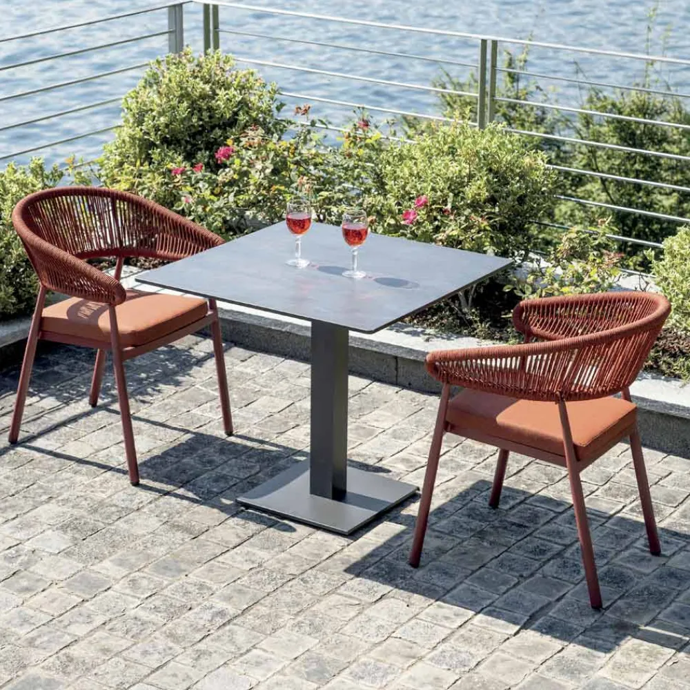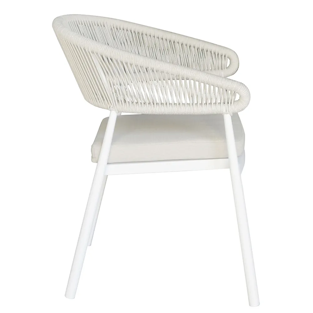Mit diesem modernen Design-Stuhl verleihen Sie Ihrem Außenbereich einen Hauch von durchdachtem Stil und Zweckmäßigkeit. Die Seilrückenlehne verleiht ihm ein Element handgefertigter Eleganz, während der Aluminium-Lamellensitz Stärke und Komfort bietet und ihn ideal für den täglichen Gebrauch macht.
