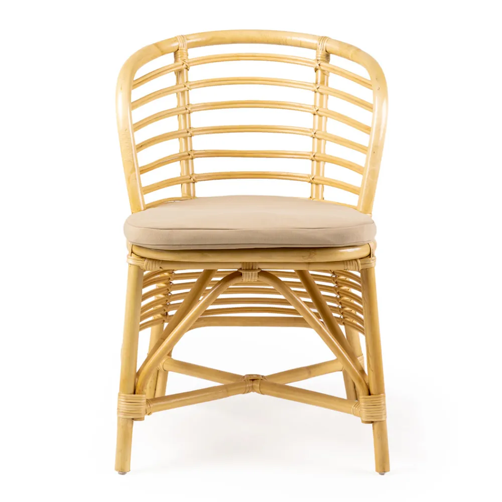 Außenstuhl aus geflochtenem Naturrattan und ausgestattet mit einem Sitzkissen mit Polsterung in der Standard „Stone Beige“ Ausführung.