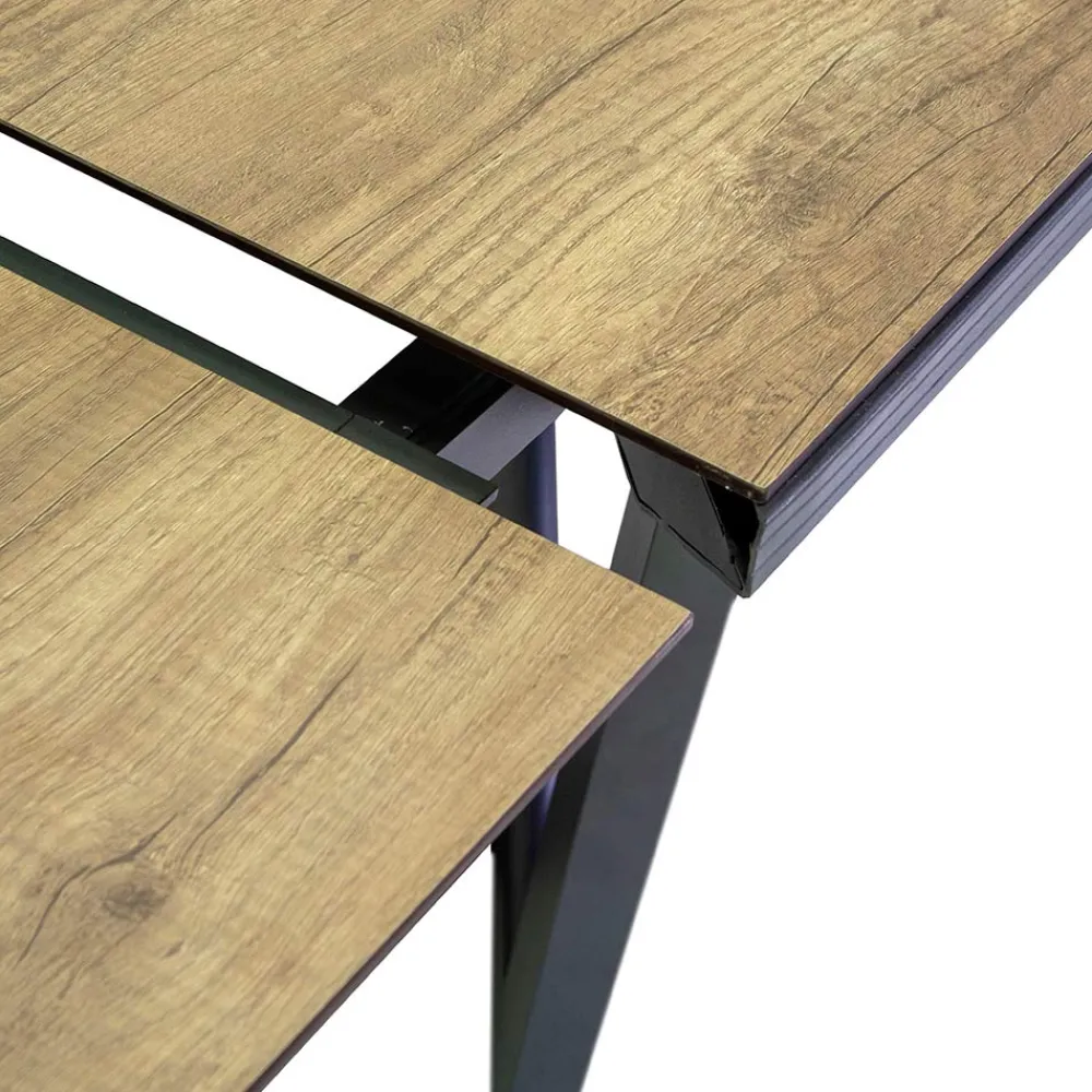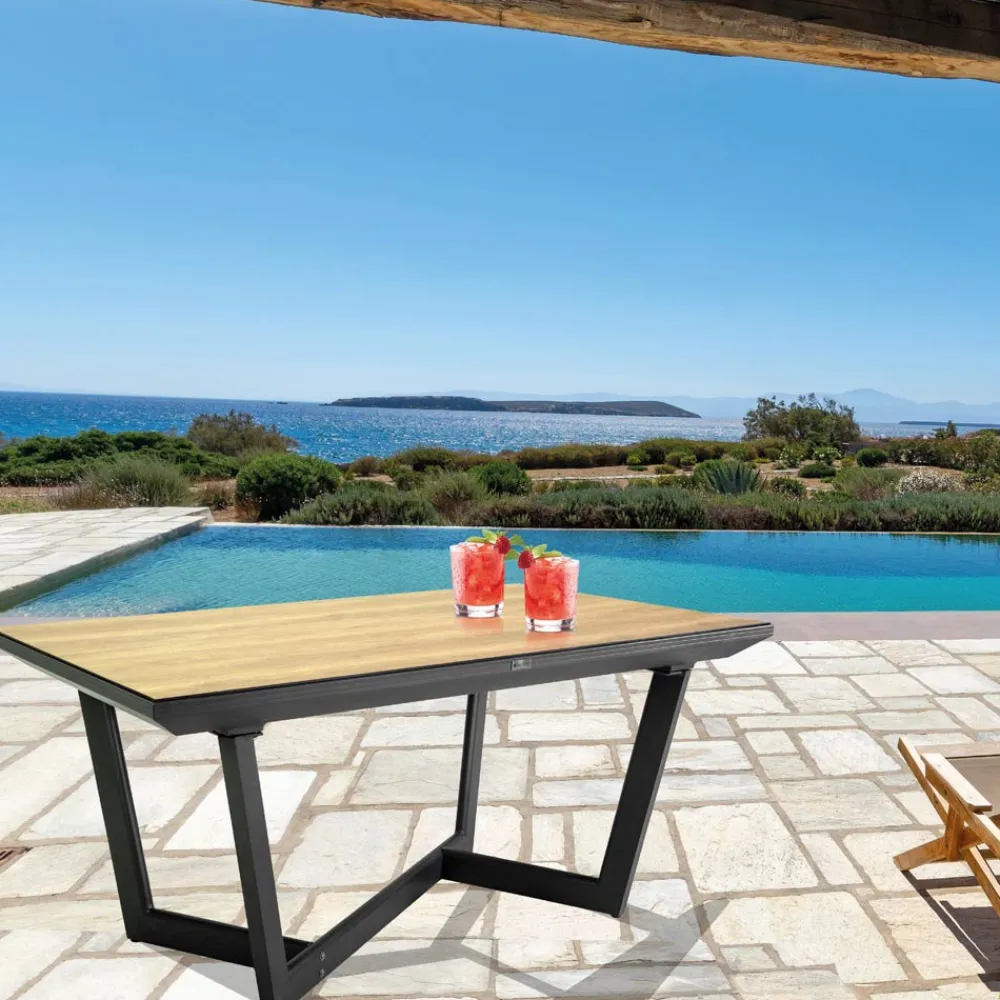 Die HPL Tischplatte zeichnet sich durch ihre Langlebigkeit und ihr wunderschönes Finish aus, das natürliches Holz imitiert und Ihrer Außendekoration eine warme und einladende Note verleiht. Die Funktion zum automatischen Öffnen der beiden Seitenflügel ist äußerst benutzerfreundlich und ermöglicht es Ihnen, den verfügbaren Platz schnell zu erweitern, um mehr Gäste unterzubringen.