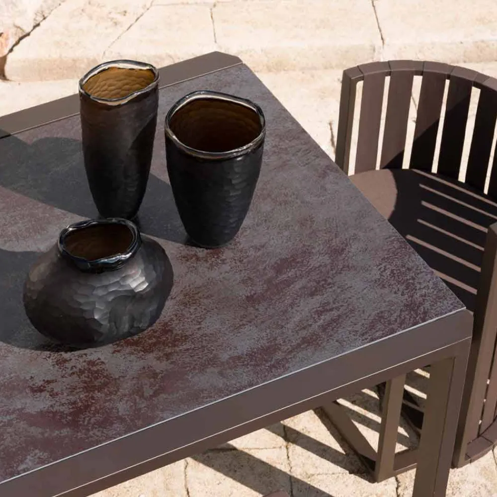 Das raffinierte , elegante und raffinierte Design dieses ausziehbaren Tisches zum Essen im Garten zeichnet sich durch den Wechsel von leeren und vollen Räumen aus, der ein leichtes und zeitgemäßes Erscheinungsbild schafft.
