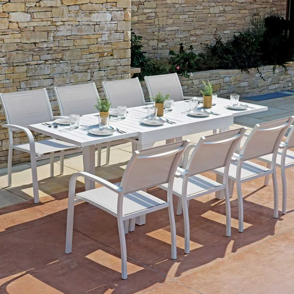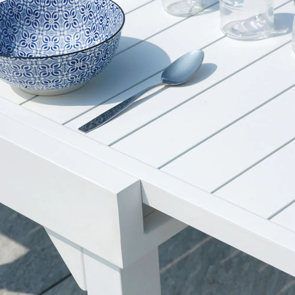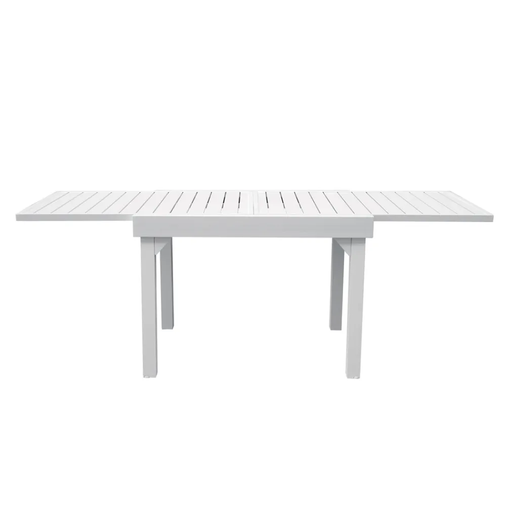 Ausziehbarer Gartentisch aus weißem Aluminiumrahmen und Lattenrost.