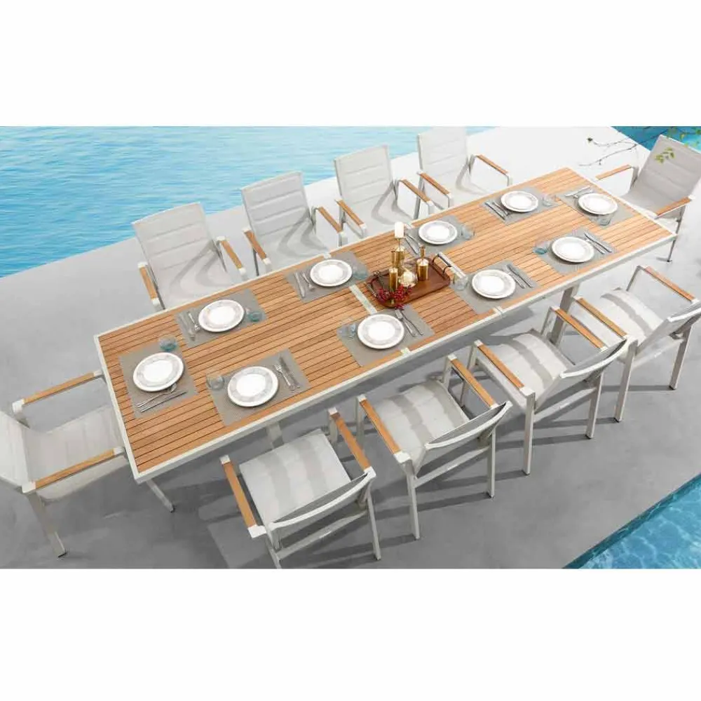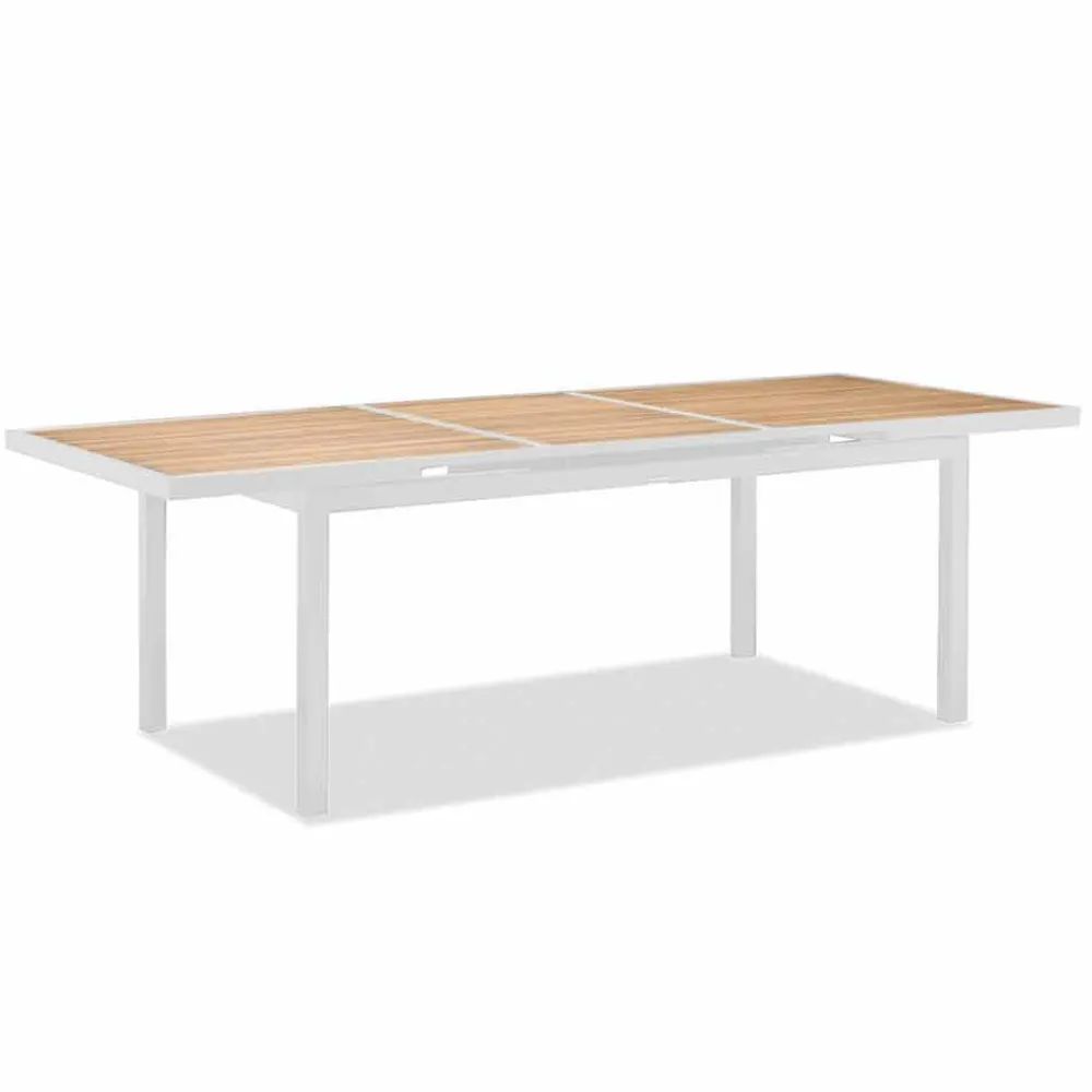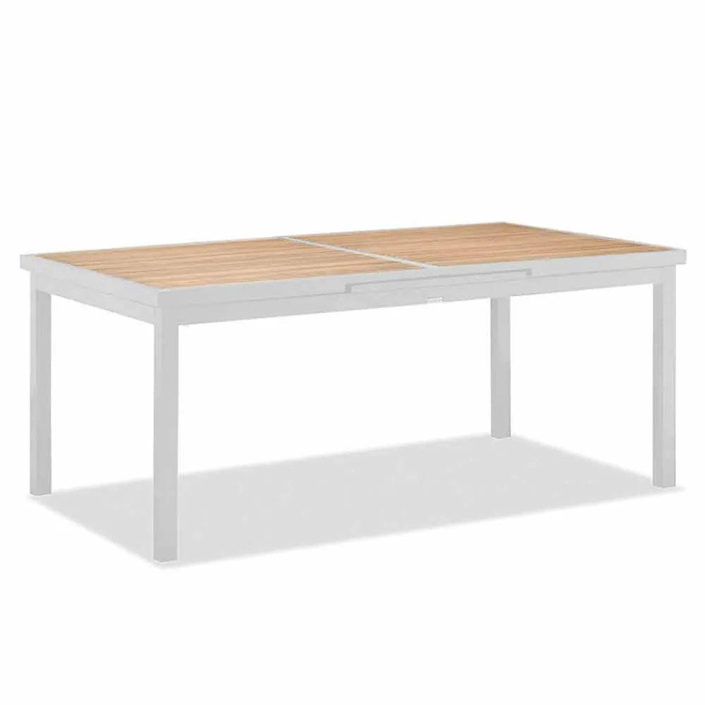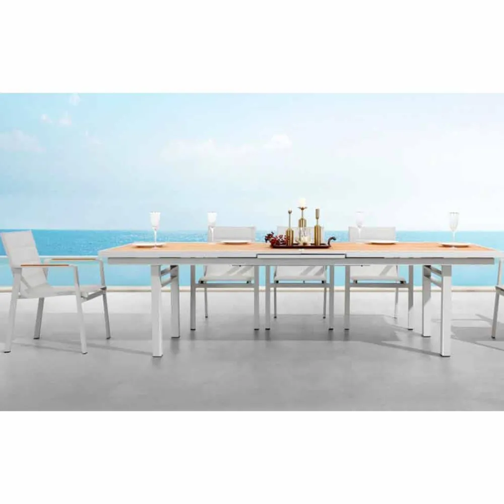 Ausziehbarer Esstisch für den Außenbereich aus Aluminium und Teakholz.