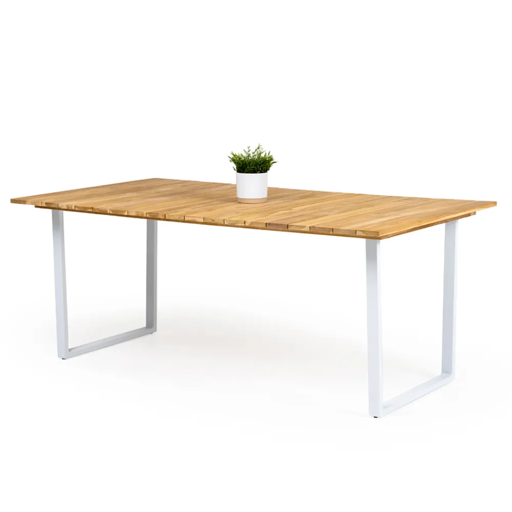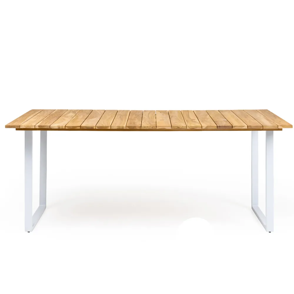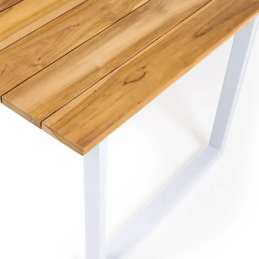 Gartentisch mit weiß lackierter Aluminiumstruktur und gebürsteter natürlicher Teakholzplatte.