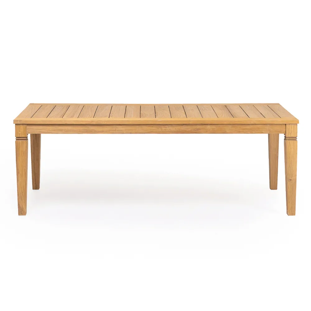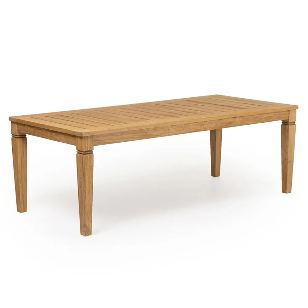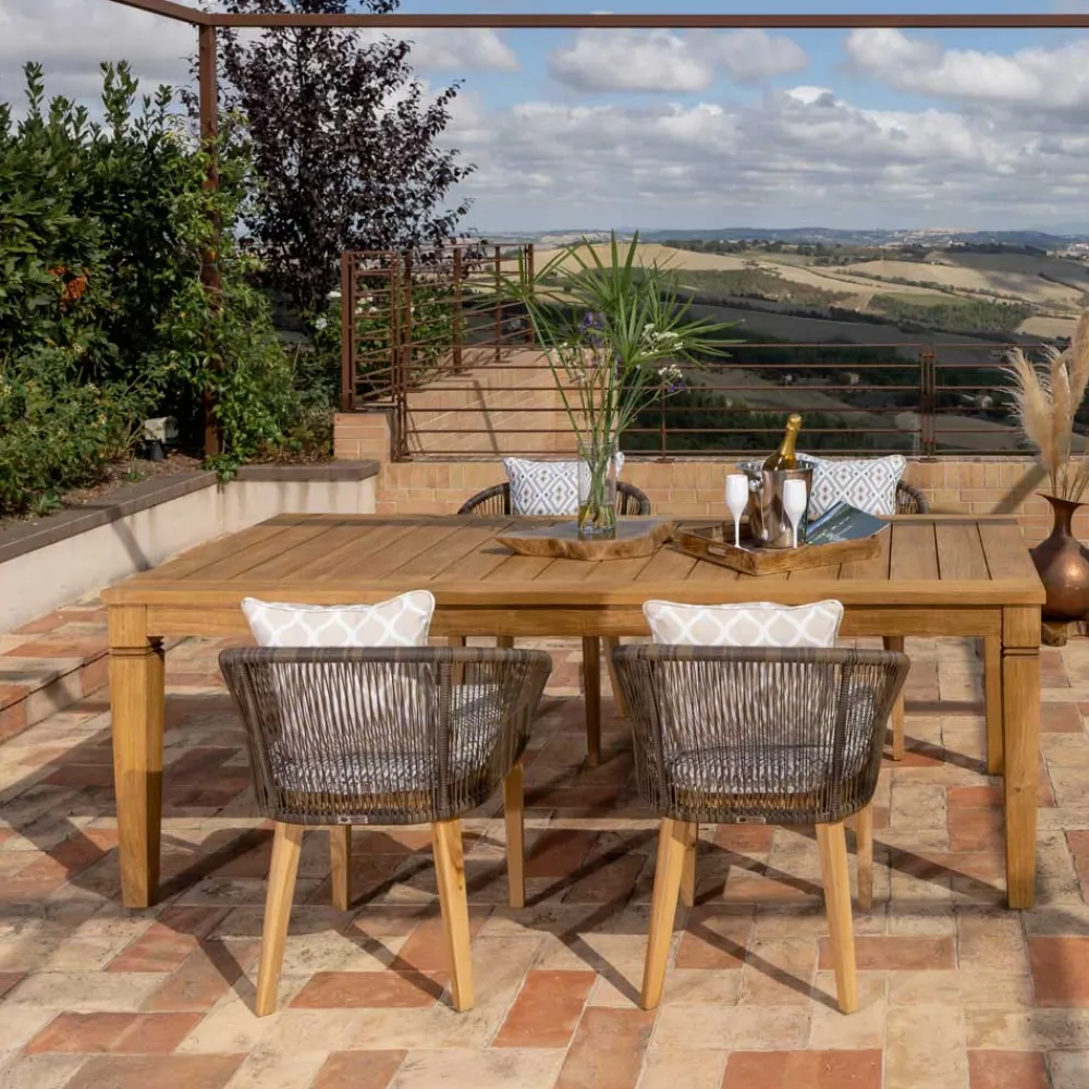 Gartentisch ganz aus Teakholz. Die Struktur dieses Tisches ist vollständig aus natürlichem Teakholz mit gebürstetem Finish und zeichnet sich durch klassische und geschwungene Linien sowie durch die wichtigen Dimensionen der Holzteile aus. Dieses Produkt mit zarten Linien ist perfekt, um dem Außenbereich dank des zeitlosen Stils des Teakholzes Wärme zu verleihen.