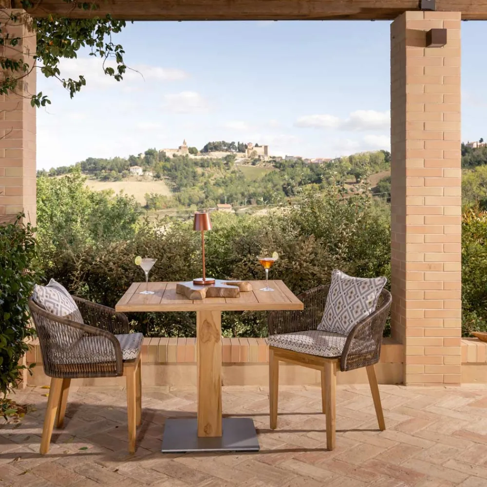 Die quadratische Form verschmilzt perfekt mit dem Metallsockel, um ein einfaches Element mit harmonischen Proportionen zu schaffen, das sich für jeden Außenbereich wie Terrassen, Veranden, Gärten oder Pools eignet, um eine charmante Atmosphäre zu schaffen. Das für die Konstruktion verwendete Teakholz garantiert Qualität und Widerstandsfähigkeit auch im Laufe der Zeit und macht dieses Einrichtungsaccessoire perfekt für jede Situation und jeden Anlass der Verwendung.