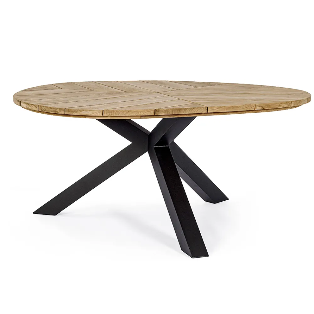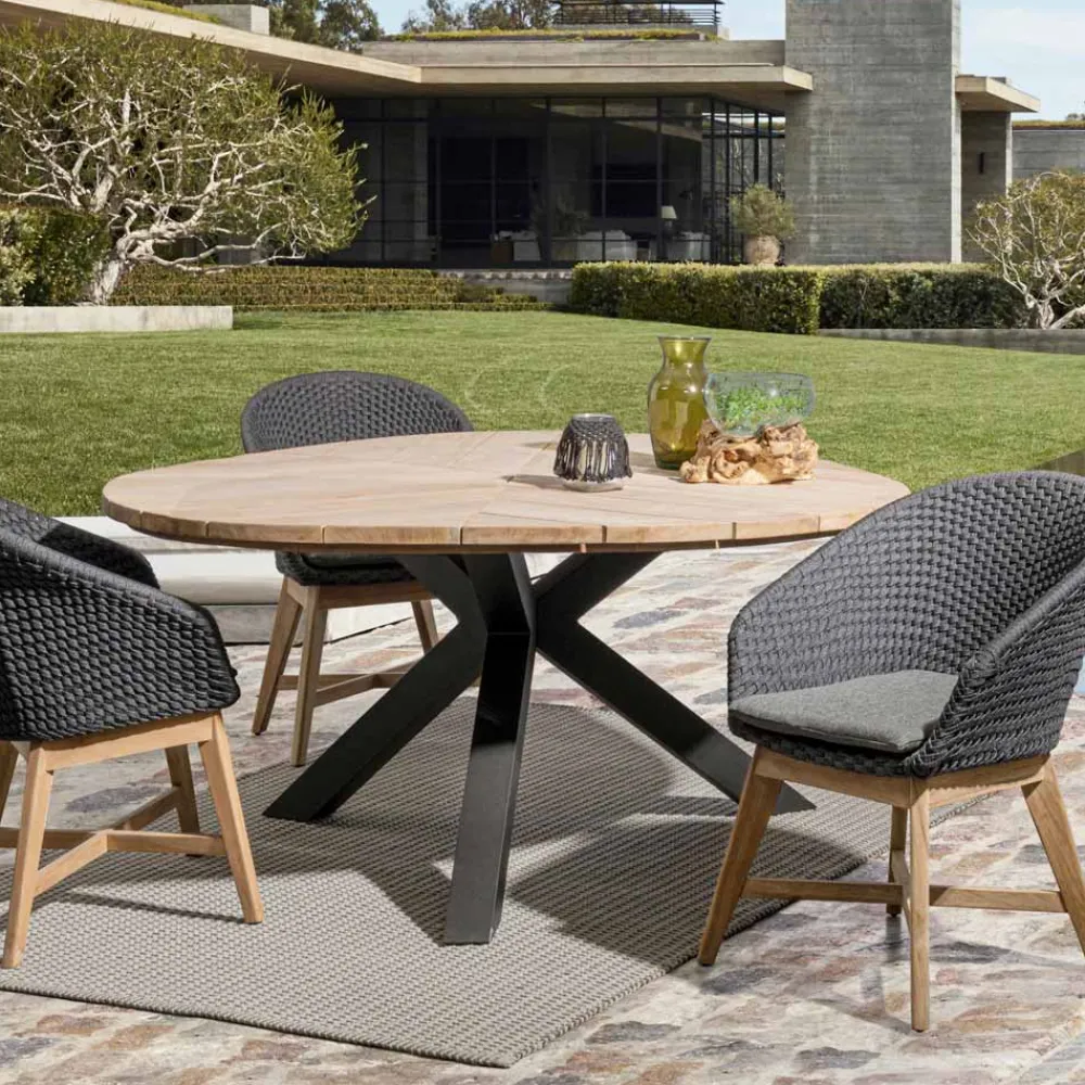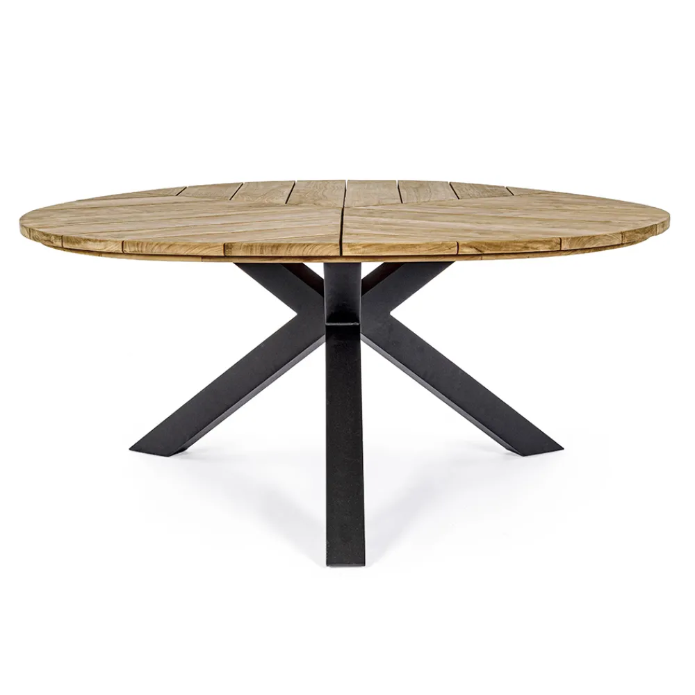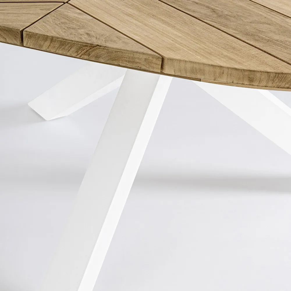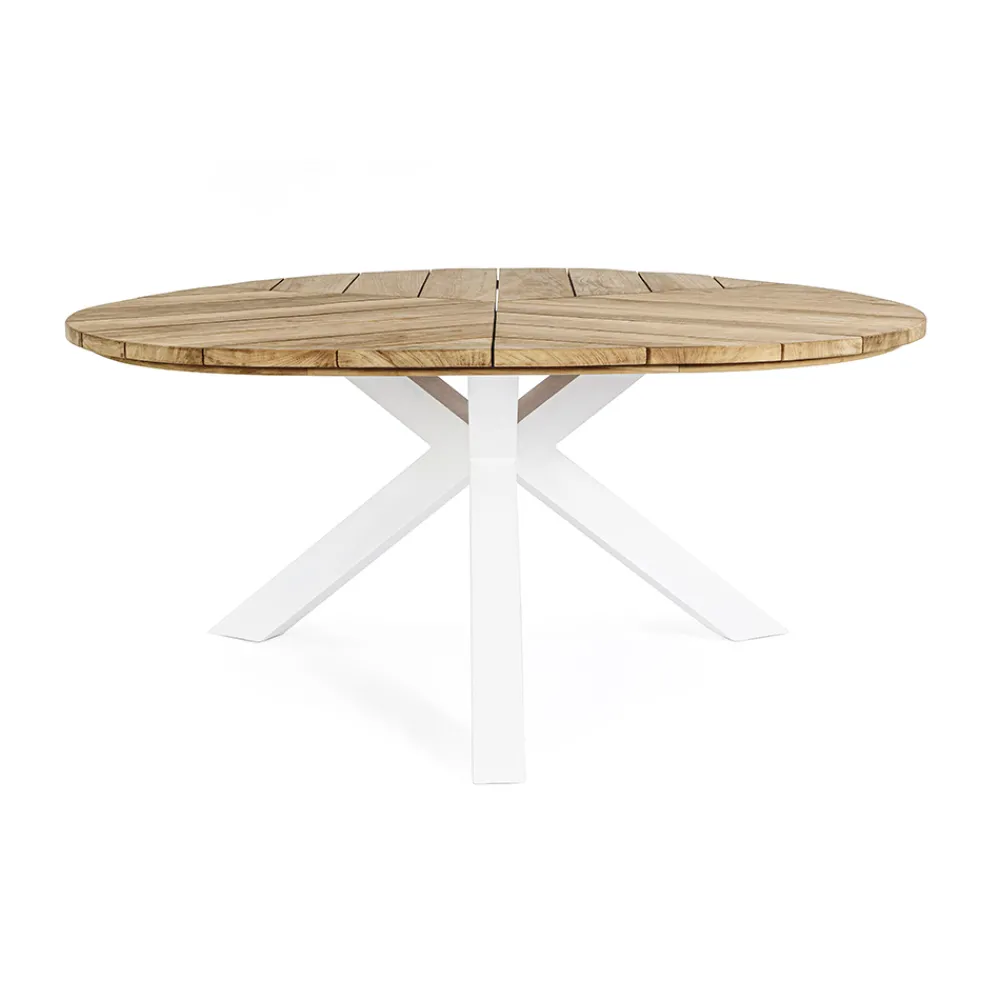 Runder Esstisch im Freien aus Aluminium mit Platte aus hochwertigem Teakholz.