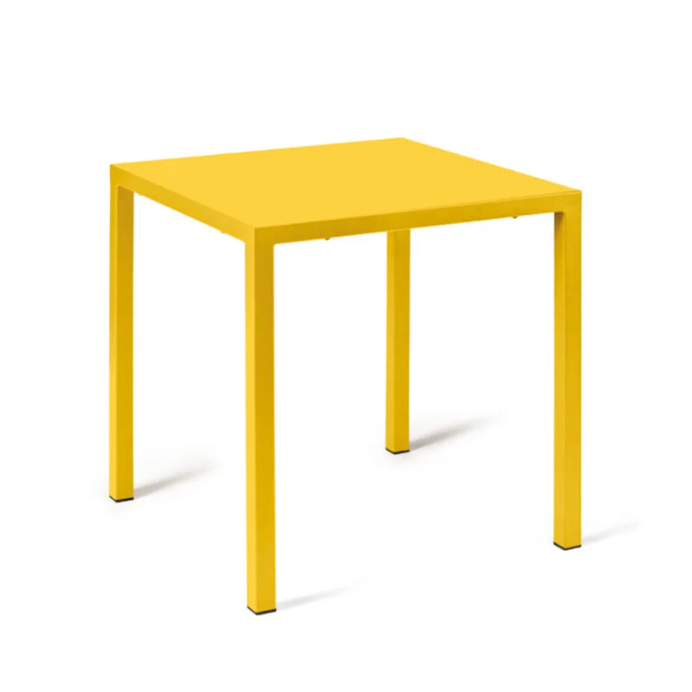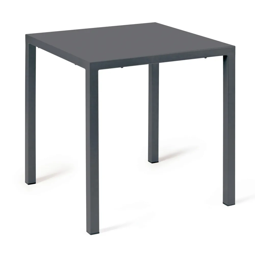 Stapelbarer und selbstnivellierender Esstisch für den Außenbereich. Made in Italy, komplett aus verzinktem Stahl mit quadratischen Beinen und 4 normalen Füßen.