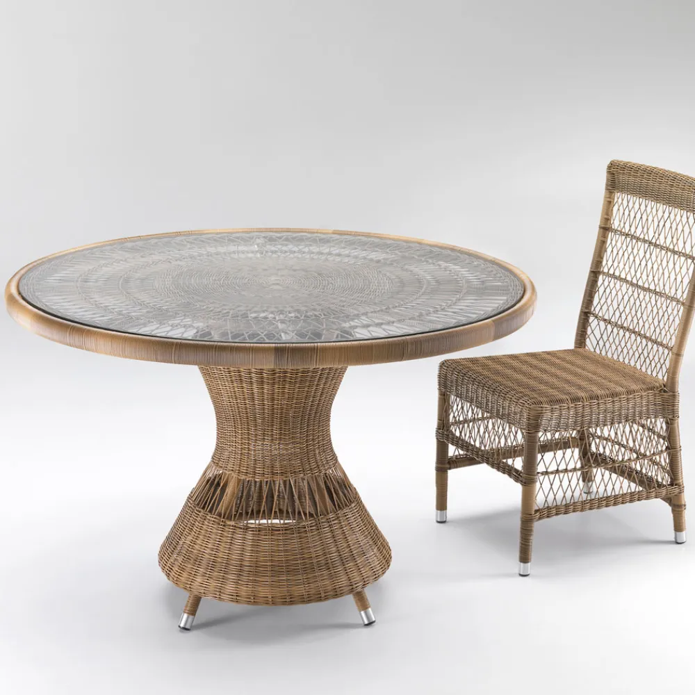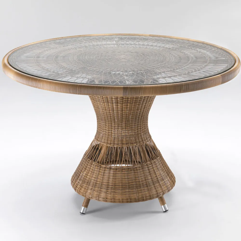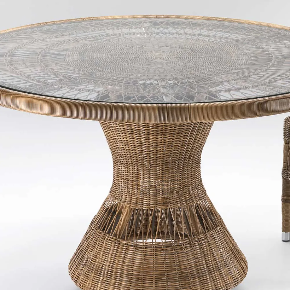 Runder Esstisch für den Außenbereich aus handgeflochtener Polyrattanfaser und Glasplatte