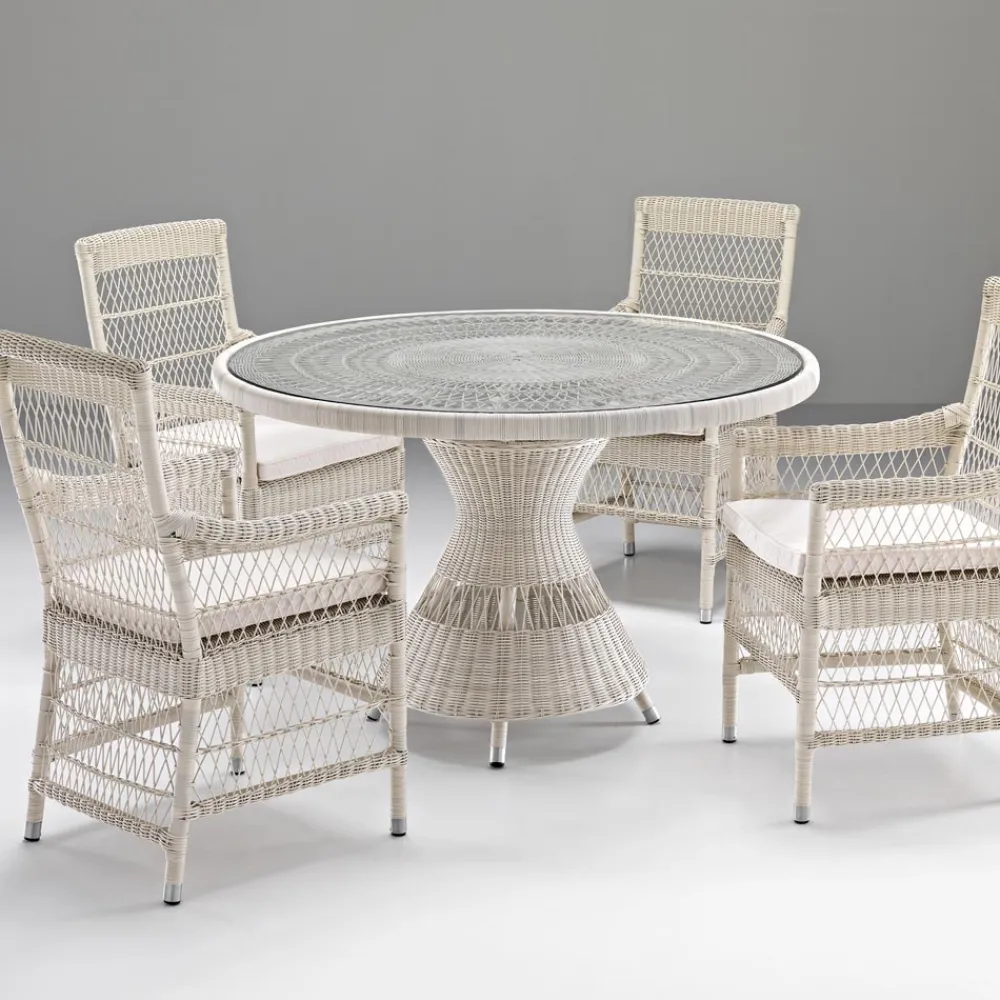 Der Geflechtstil ist raffiniert und zart und zusammen mit der sehr hohen Qualität der Materialien und seinen entschiedenen Formen machen diesen Tisch perfekt für die Innen- und Außeneinrichtung, sowohl für private als auch für gewerbliche Umgebungen wie Terrassen, Veranden, Gärten, aber sie finden auch einen perfekten Platz am Pool.