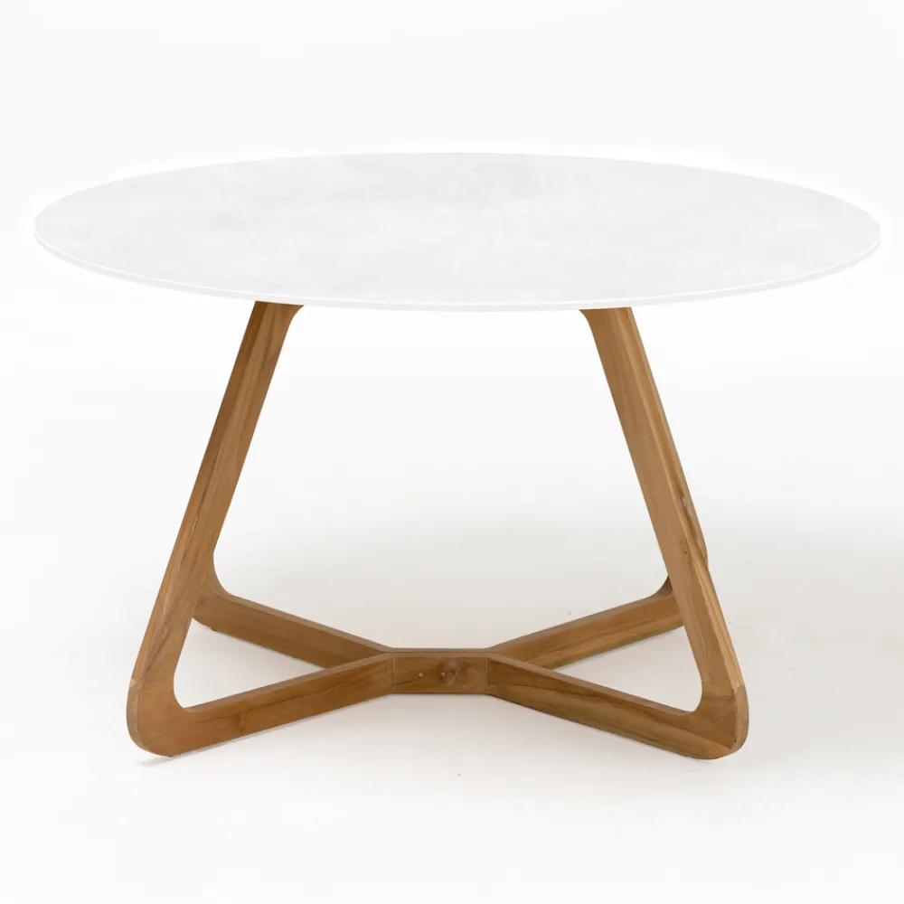 Tisch für den Außenbereich mit einem Untergestell aus natürlichem Teakholz (35 mm dick), einer Platte aus Feinsteinzeugkeramik (12 mm dick) mit einer matten Total White Oberfläche und einem Untergestell aus Okumé Marinesperrholz , komplett Made in Italy.