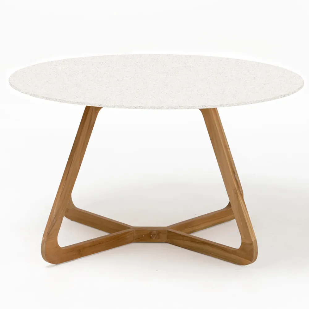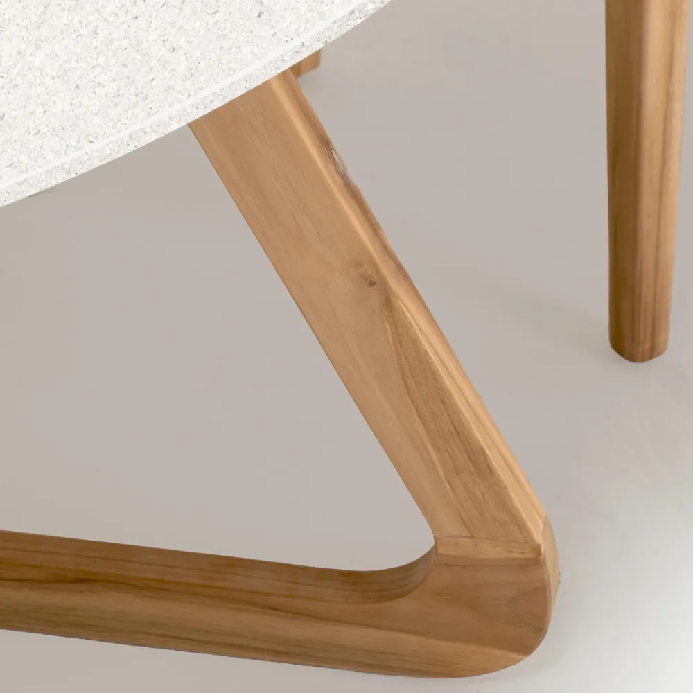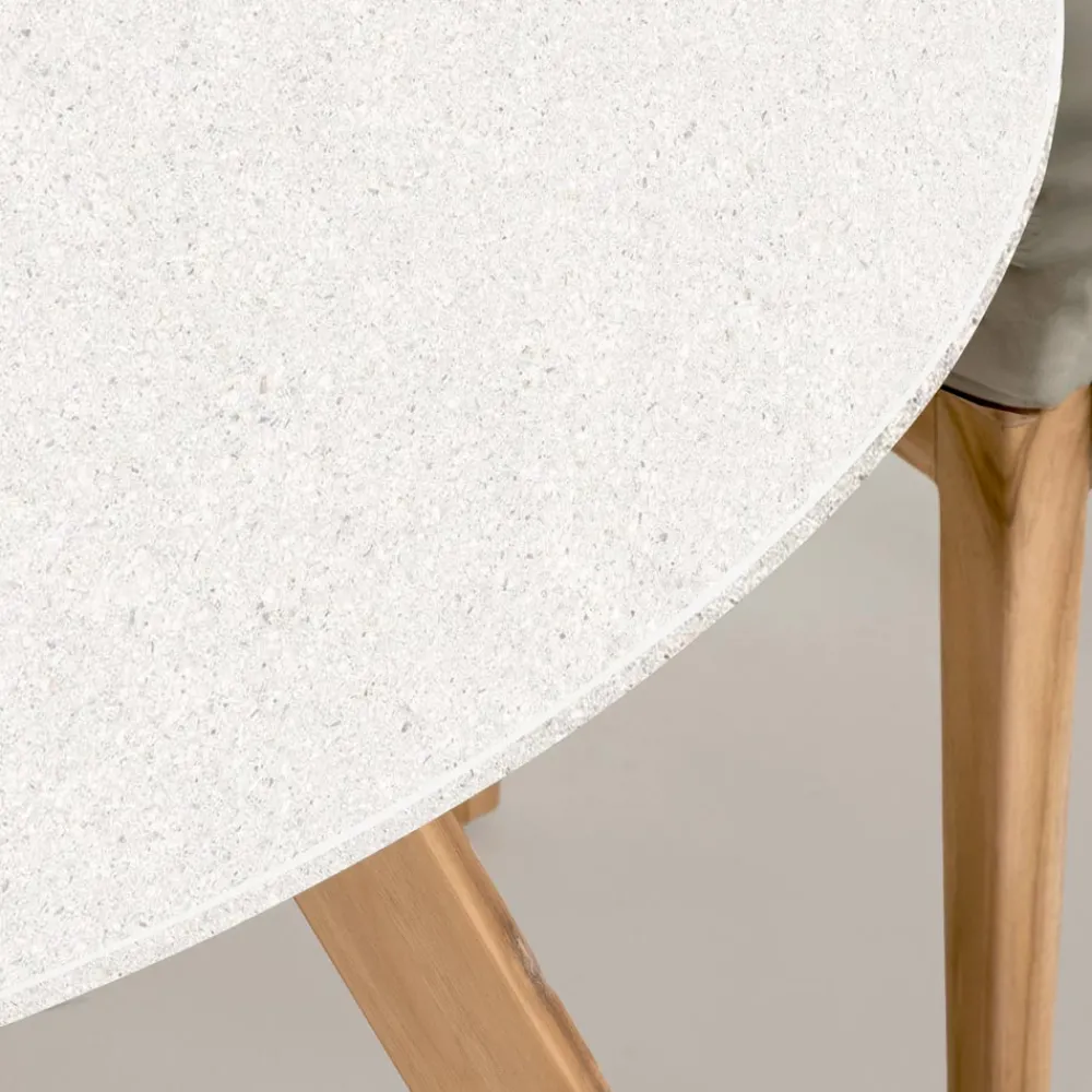 Tisch für den Außenbereich mit einem Untergestell aus natürlichem Teakholz (35 mm dick), einer Platte aus Feinsteinzeugkeramik (12 mm dick) mit matter Terrazzo White Oberfläche und einem Untergestell aus Okumé Marinesperrholz , komplett Made in Italy.