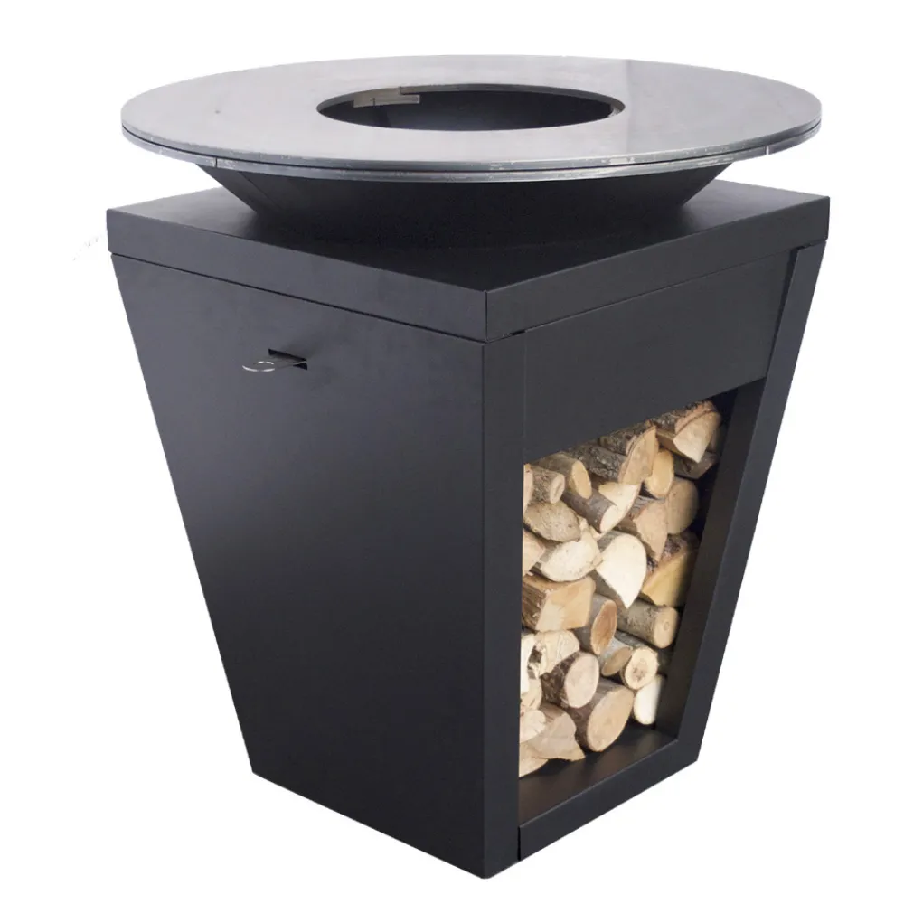 Design Gartengrill mit Feurbetrieb Mehrausstattung: Holzhalterung, Kochplatte, Aschenbehälter und Lufteinlass.