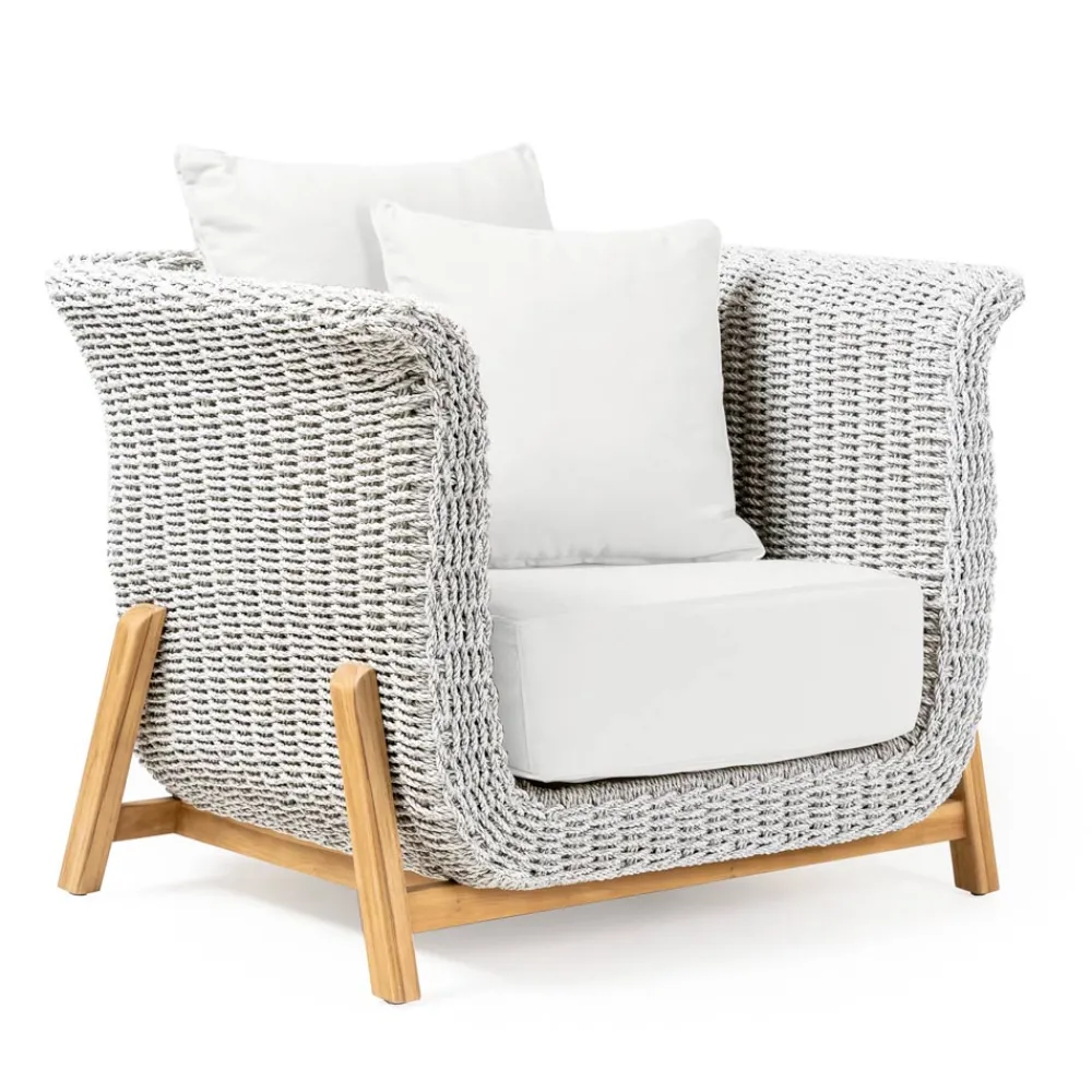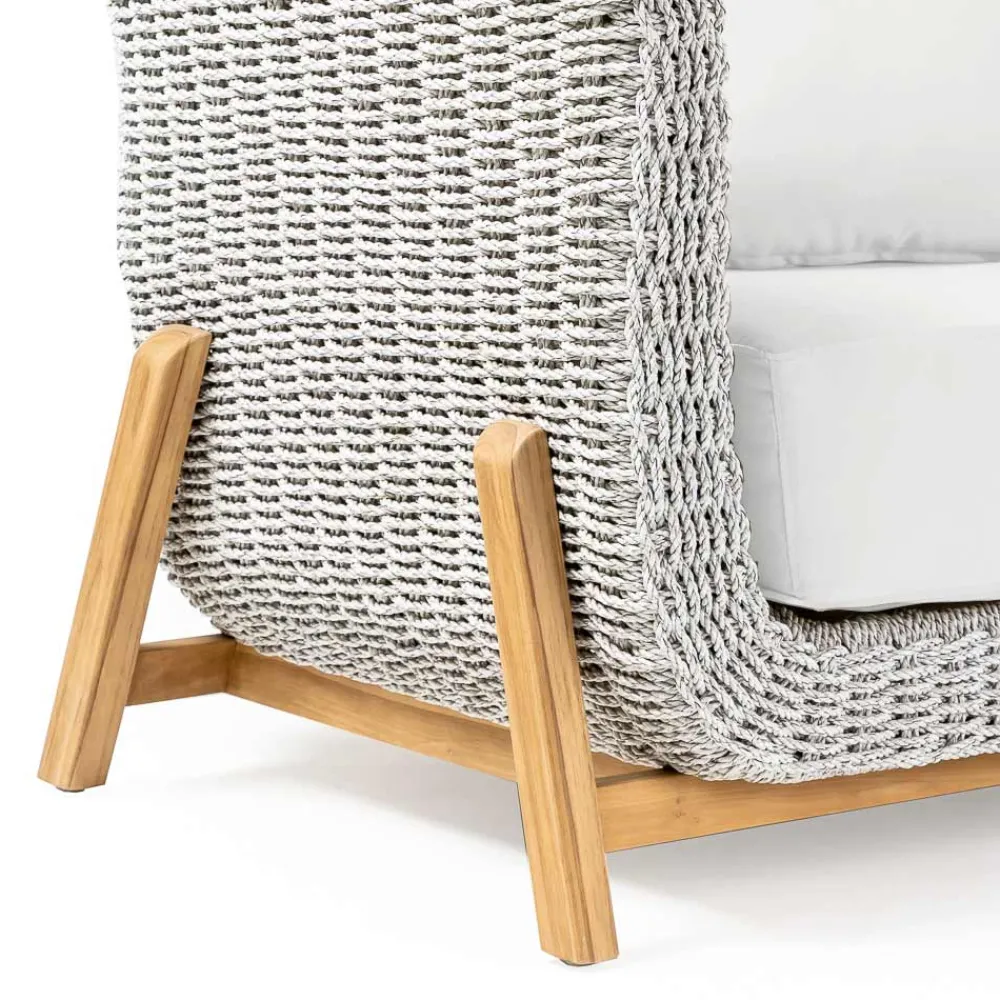 Dieser Sessel für den Außenbereich besteht aus einer inneren Struktur aus epoxidpulverbeschichtetem Aluminium, einem Gestell aus Teakholz und einem handgeflochtenen VRO-Seil-Einsatz. Er ist vollständig mit Sitz- und Rückenkissen aus wasserabweisendem Stoff in Havanna grau.
