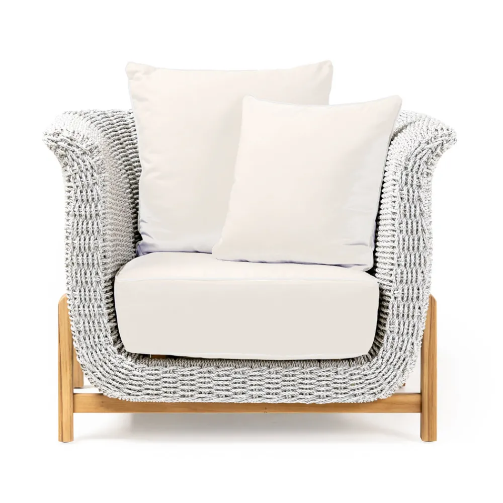 Dieser Sessel hat ein off-white farbiges Geflecht, während die Standardkissen in havanna grey Farbe sind.