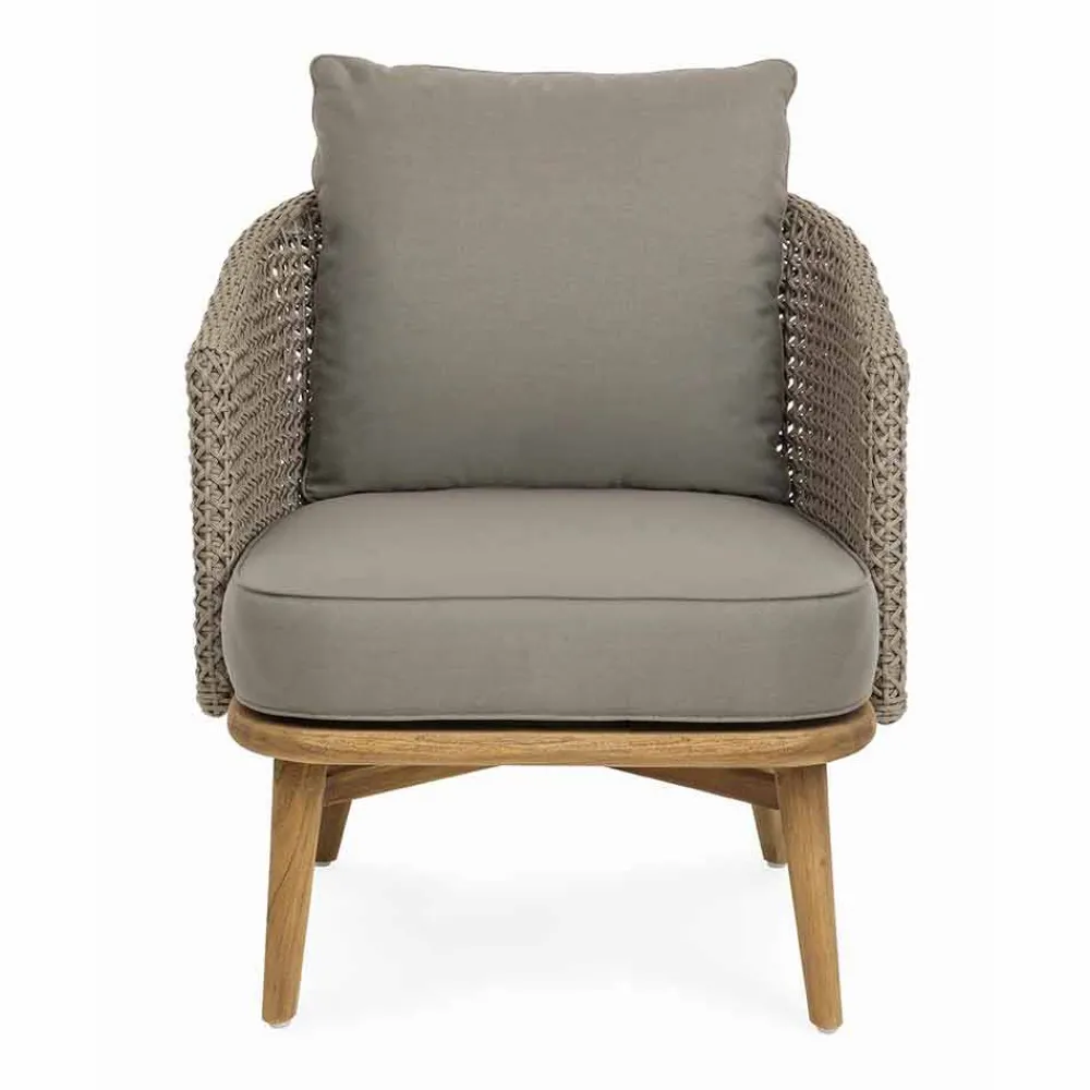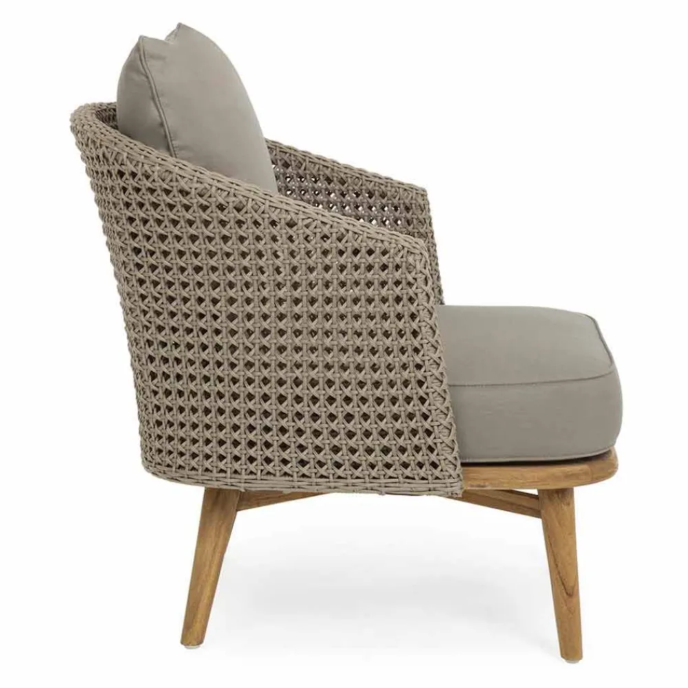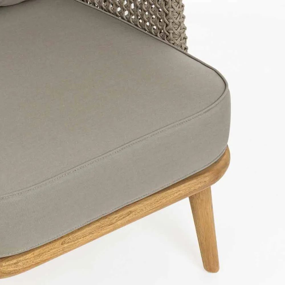 Moderner Gartensessel aus taubengrauem Aluminium mit Kissen und Seilbindung, Holzbeine.