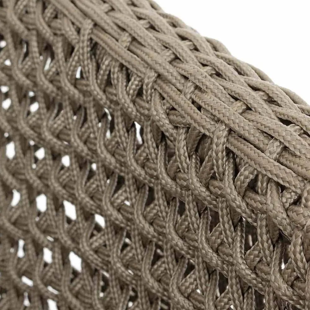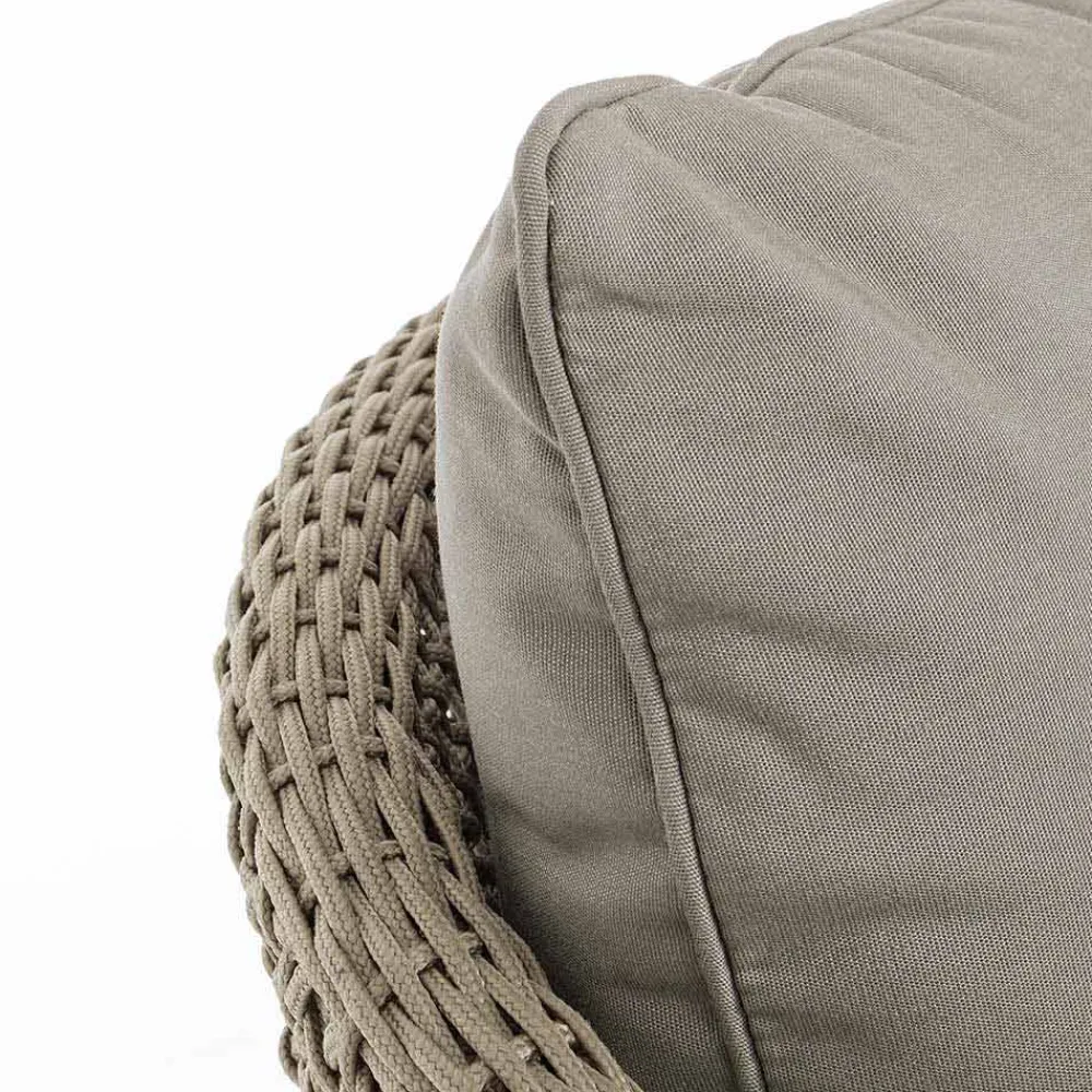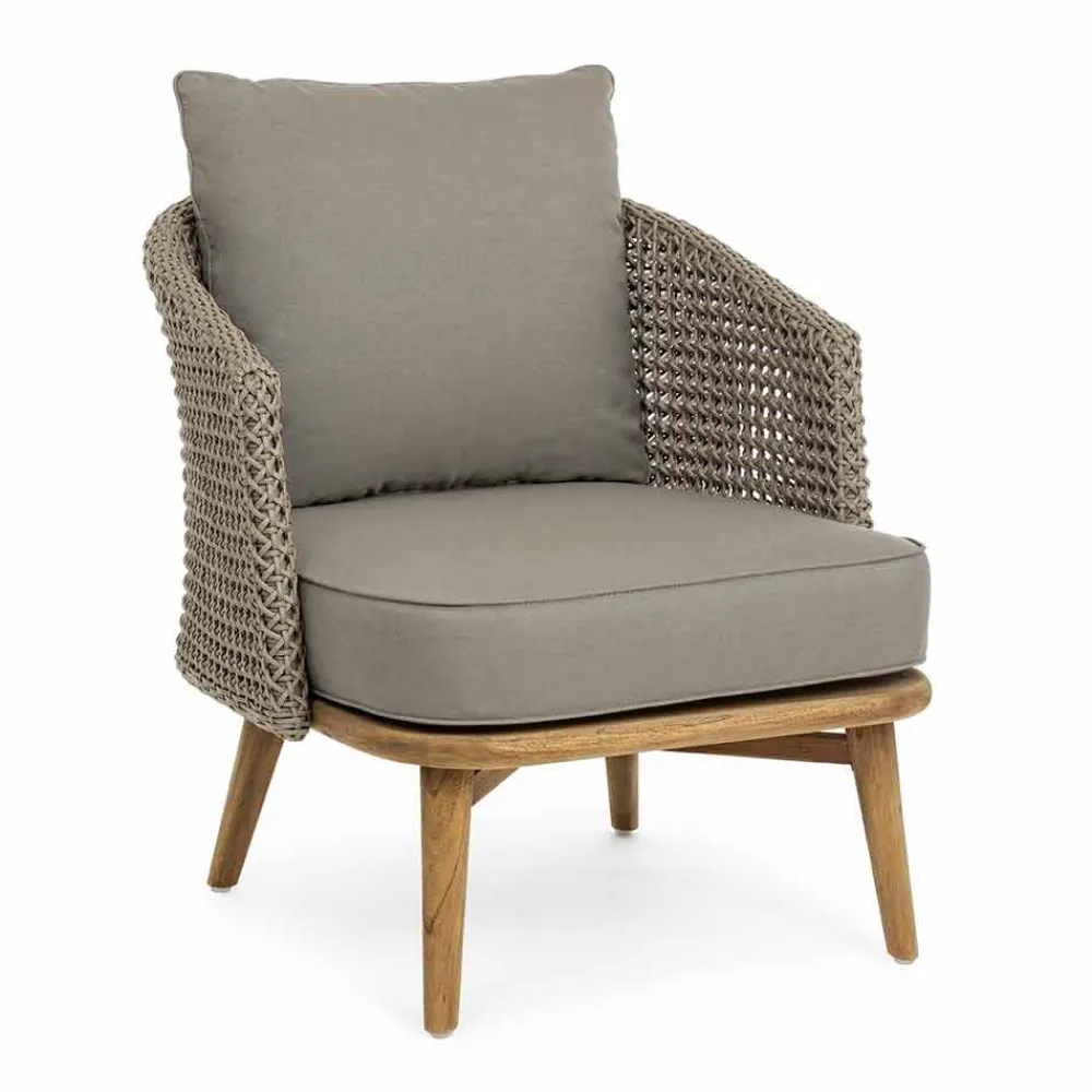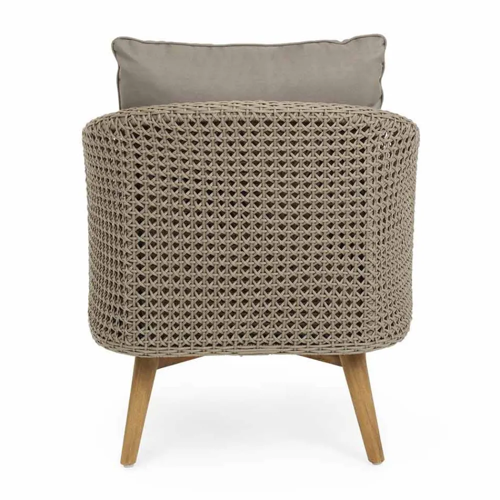 Moderner Gartensessel aus taubengrauem Aluminium mit Kissen und Seilbindung, Holzbeine.